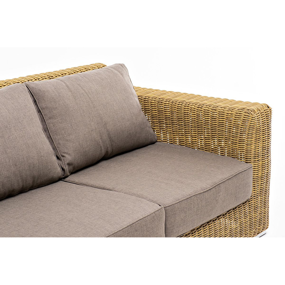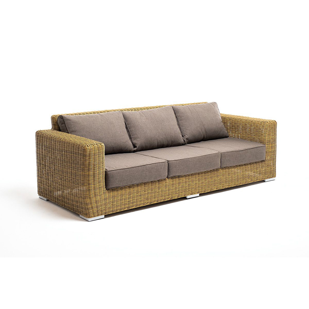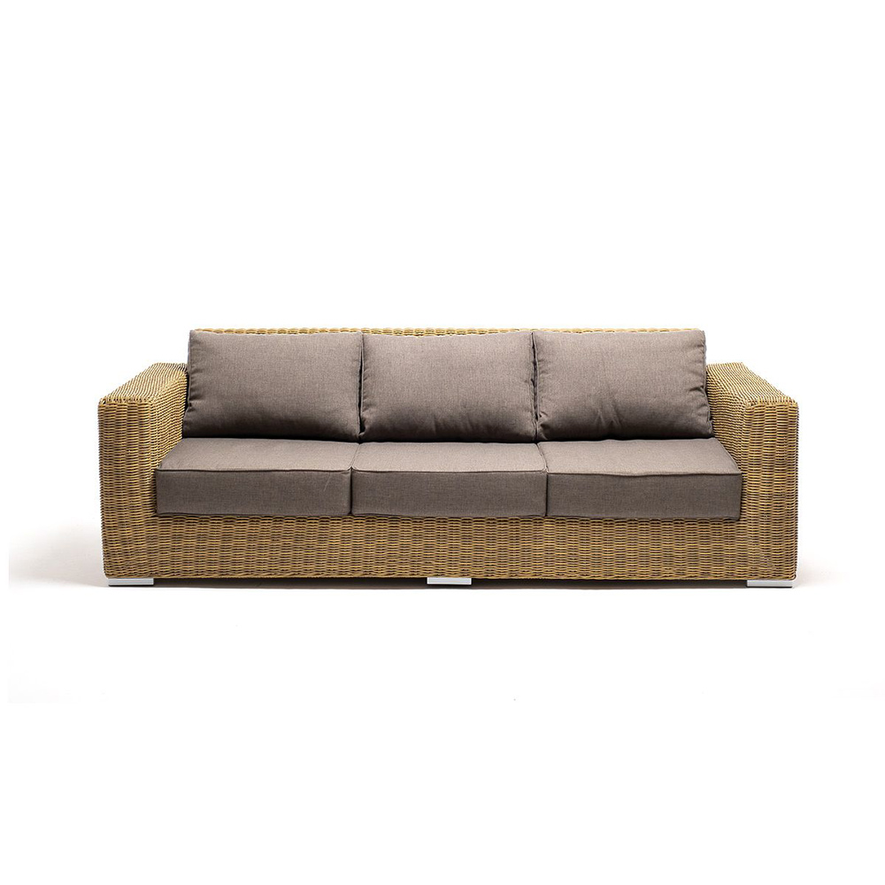 Диван «Боно» подходит для размещения сразу трех персон. Его основа из прочного алюминиевого каркаса. Размер модели – 2300*900*775 мм, толщина подушки: 150 мм, вес: 45 кг.Ручное круглое плетение является основным декоративным элементом мебели. Оно выполнено из искусственного ротанга в коричневом цвете.В комплекте с трехместным диваном идут мягкие подушки для комфортного расположения. Чехлы съемные серо-коричневого цвета из высококлассного полиэстера с плотностью 230гр/м2. Защитные свойства ткани усиливаются при помощи влагоотталкивающей пропитки.