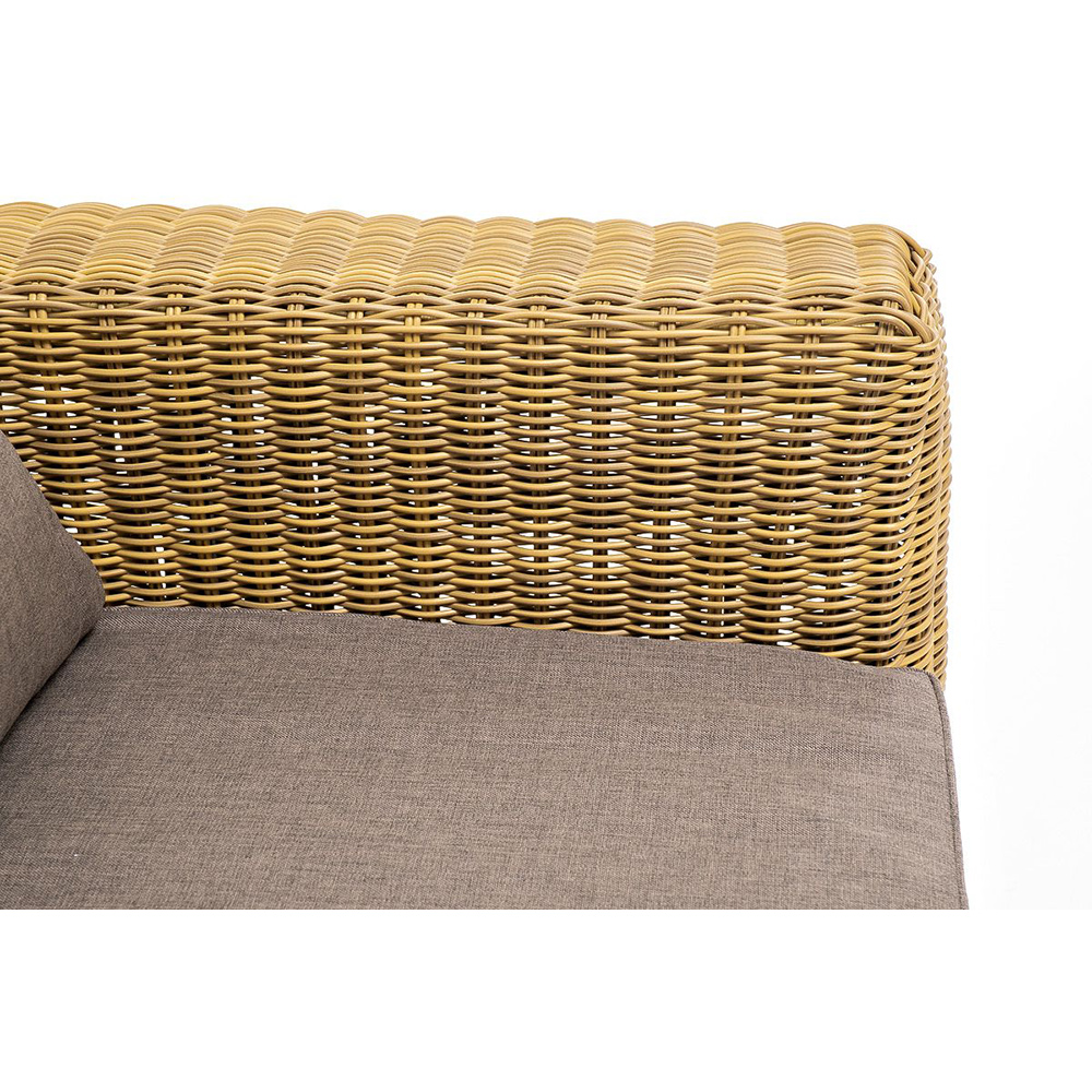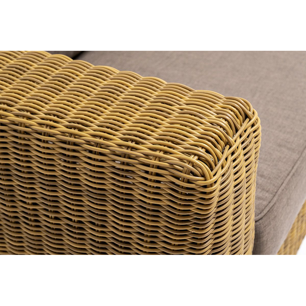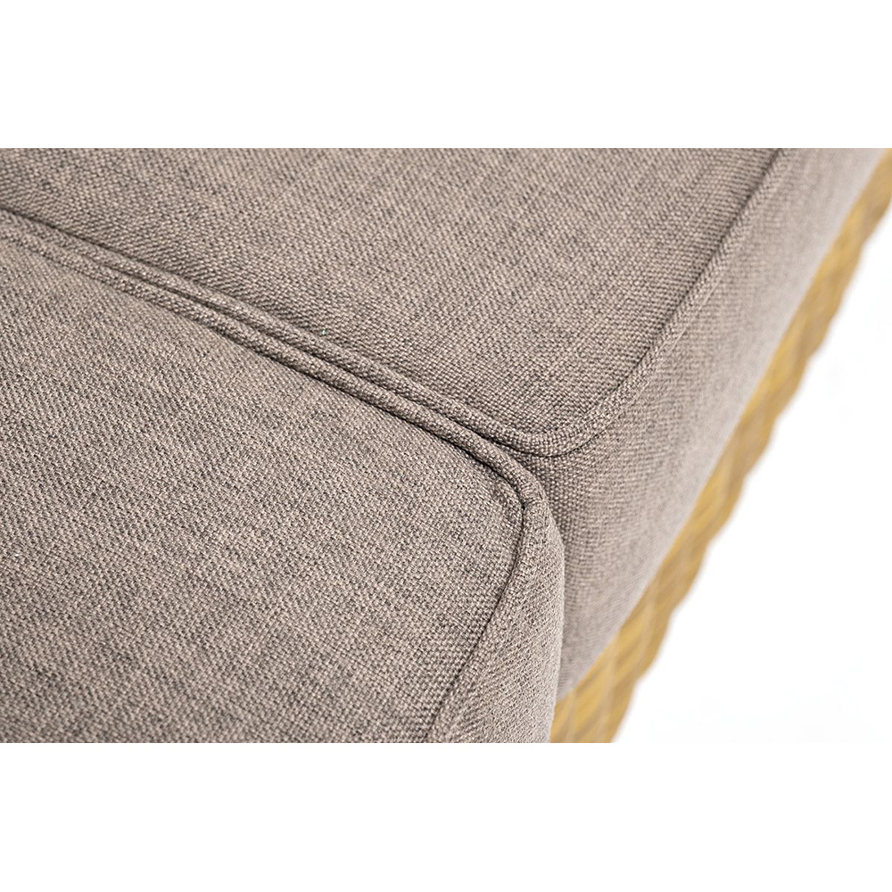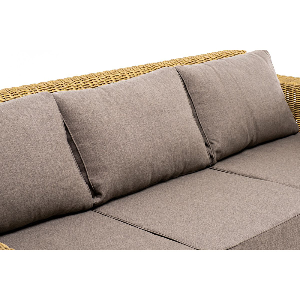 Диван «Боно» подходит для размещения сразу трех персон. Его основа из прочного алюминиевого каркаса. Размер модели – 2300*900*775 мм, толщина подушки: 150 мм, вес: 45 кг.Ручное круглое плетение является основным декоративным элементом мебели. Оно выполнено из искусственного ротанга в коричневом цвете.В комплекте с трехместным диваном идут мягкие подушки для комфортного расположения. Чехлы съемные серо-коричневого цвета из высококлассного полиэстера с плотностью 230гр/м2. Защитные свойства ткани усиливаются при помощи влагоотталкивающей пропитки.