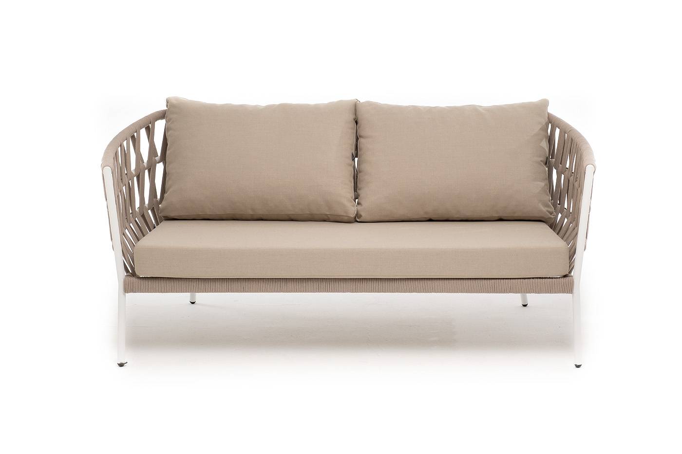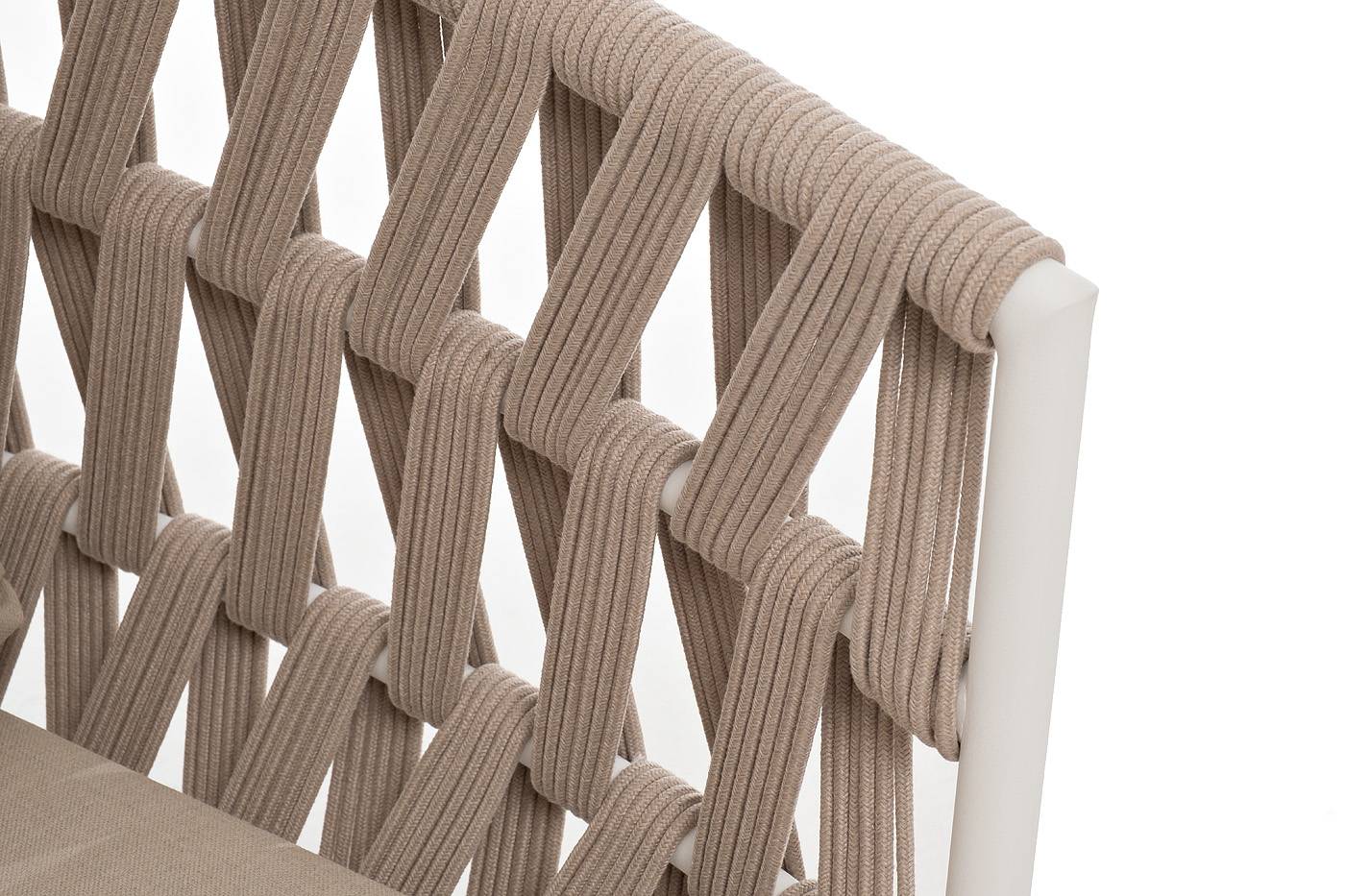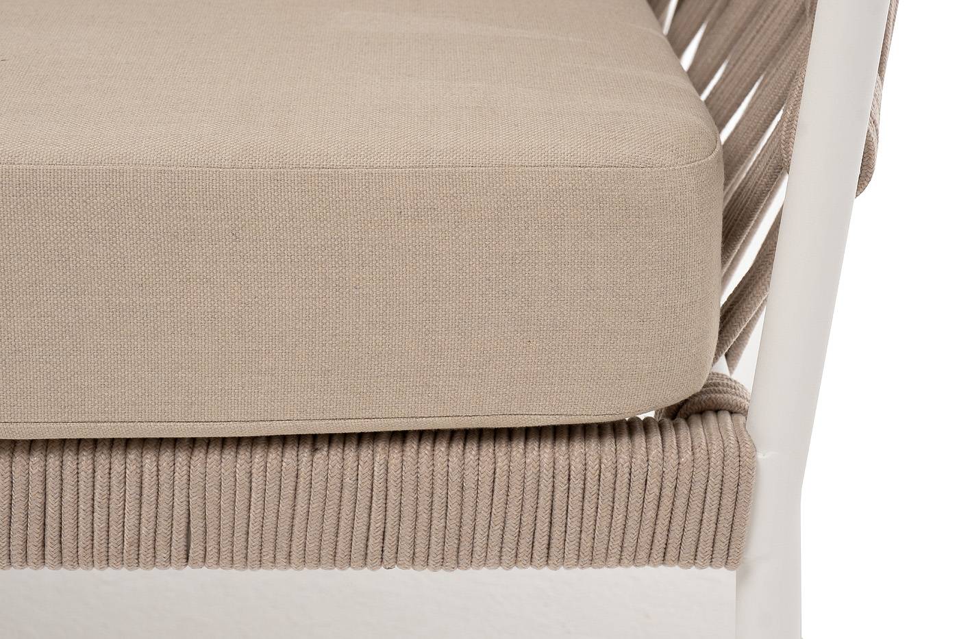 Диван имеет алюминиевый каркас, окрашенный порошковой краской в белый цвет. Боковины каркаса и спинка вручную оплетены роупом - эластичными синтетическими лентами, изготовленными из высокопрочных полиэфирных волокон. Цвет оплетки - бежевый.