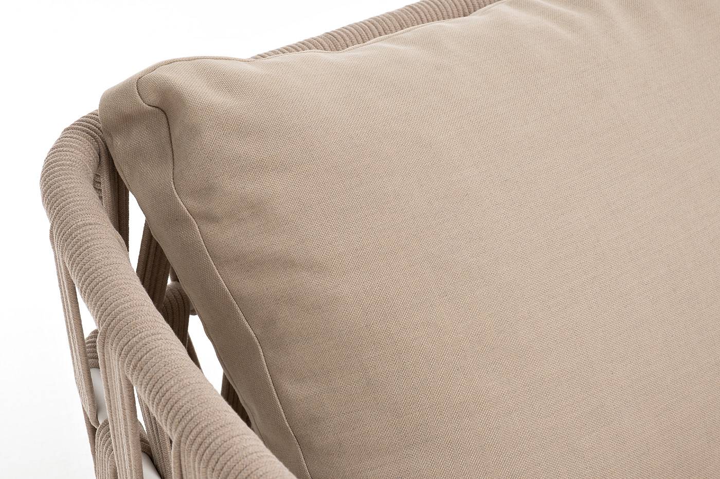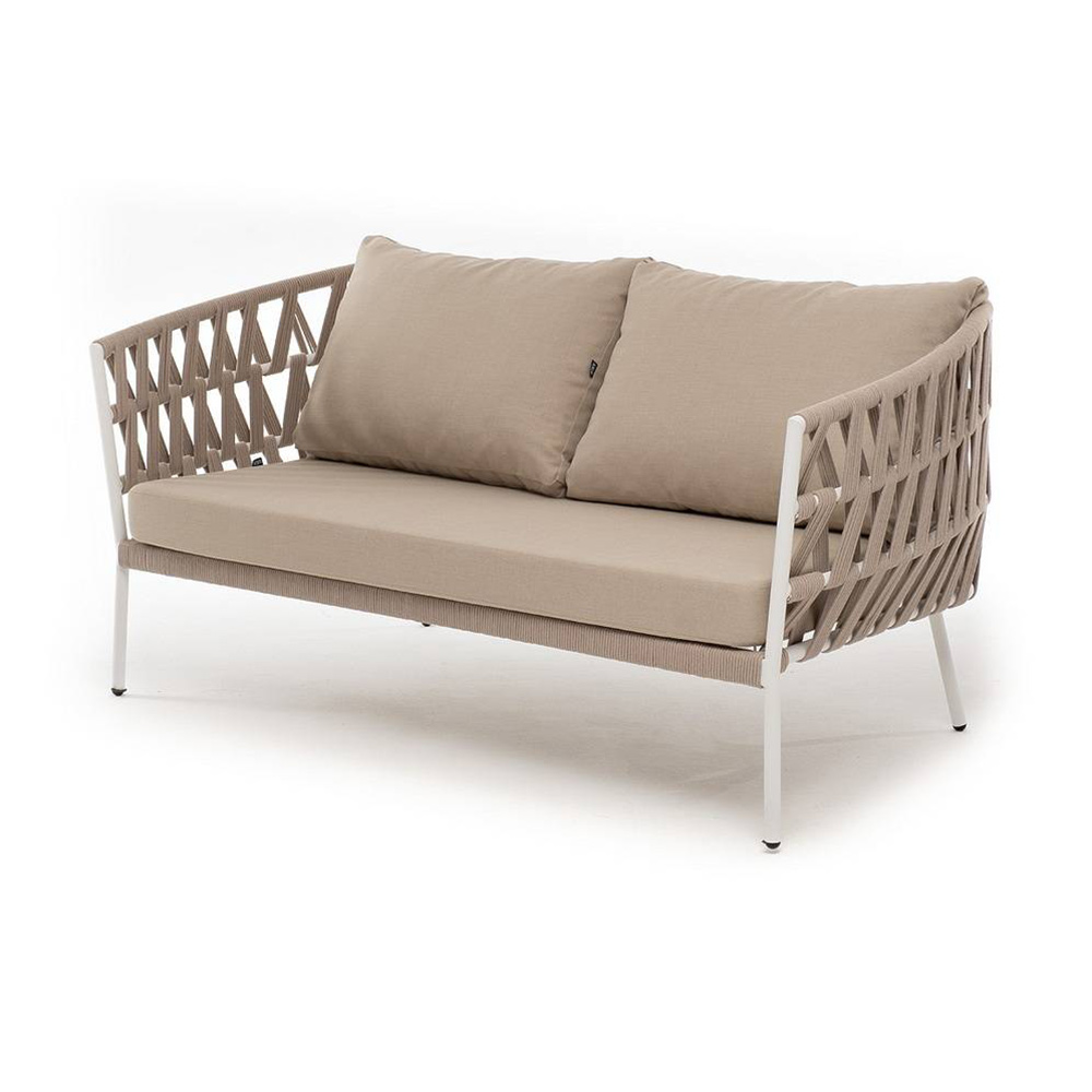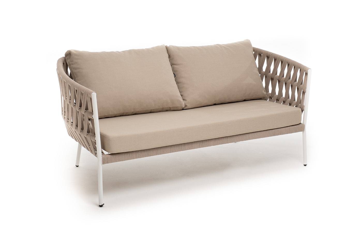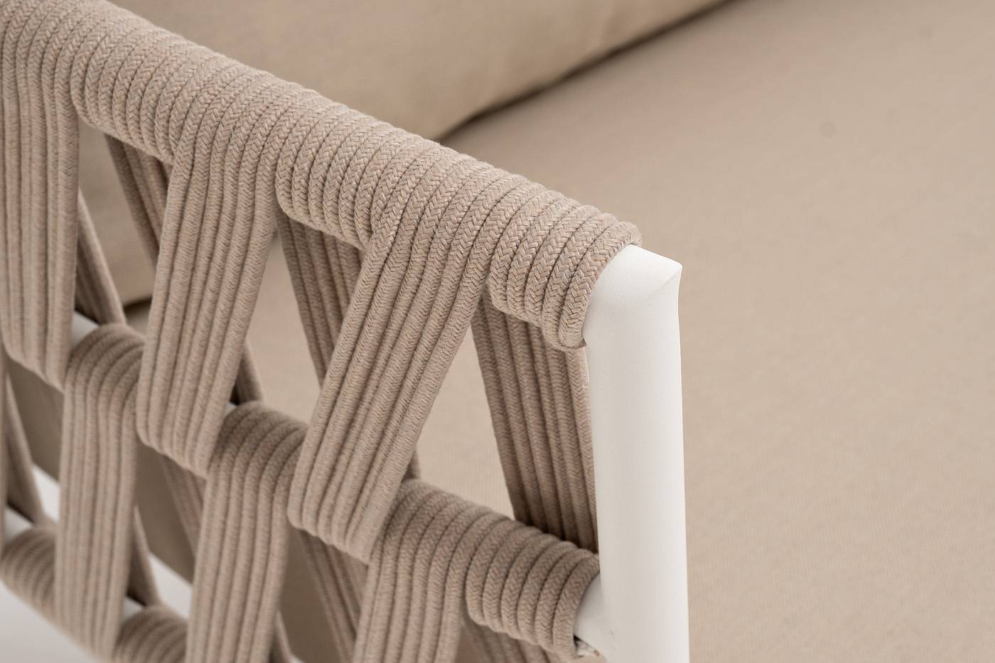 Диван имеет алюминиевый каркас, окрашенный порошковой краской в белый цвет. Боковины каркаса и спинка вручную оплетены роупом - эластичными синтетическими лентами, изготовленными из высокопрочных полиэфирных волокон. Цвет оплетки - бежевый.