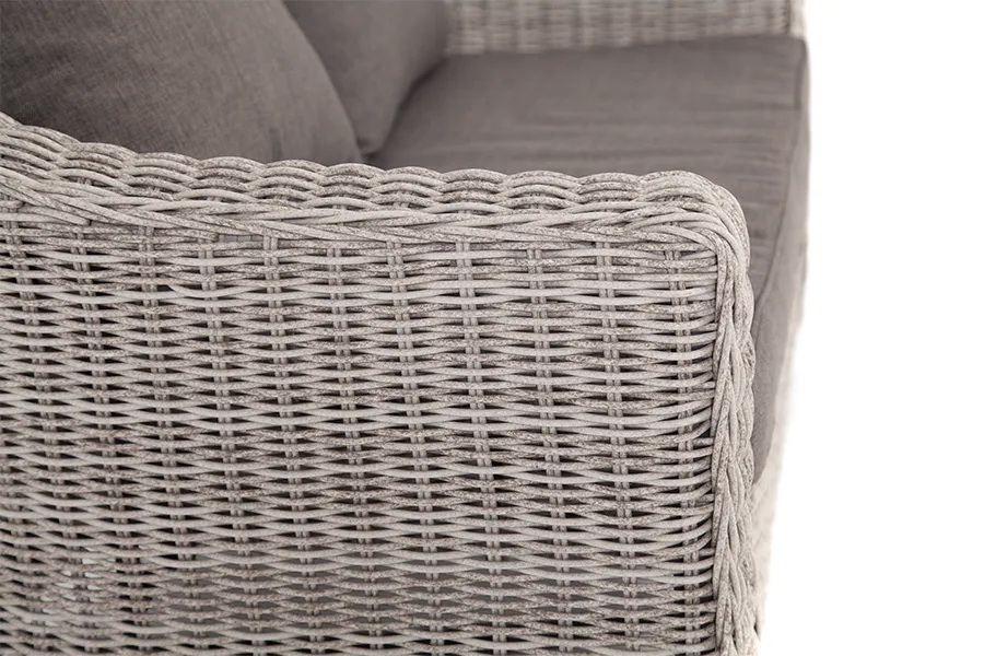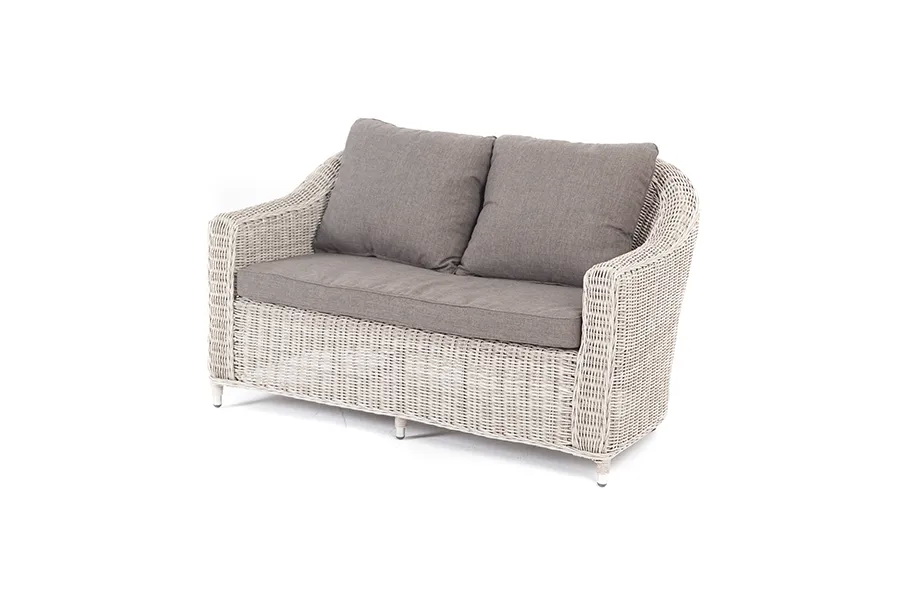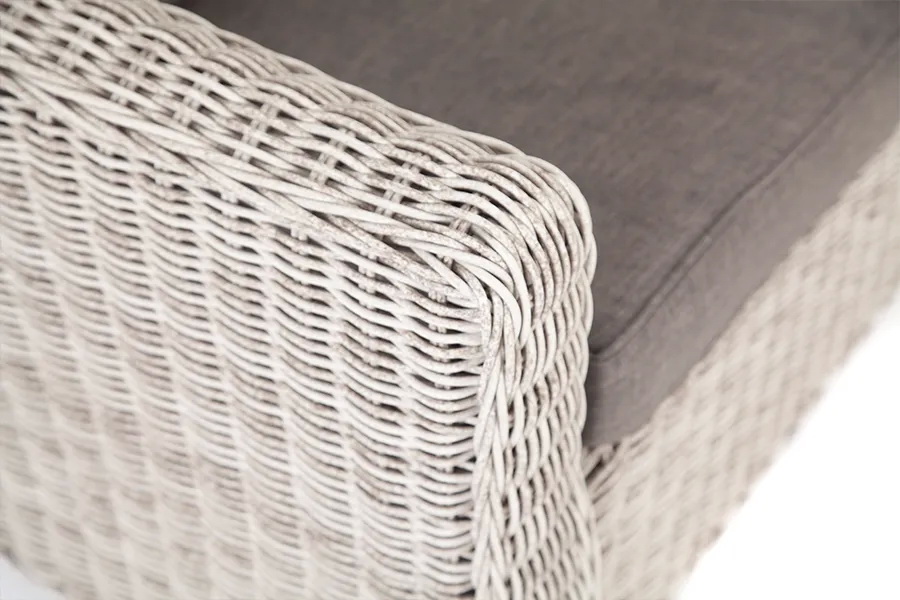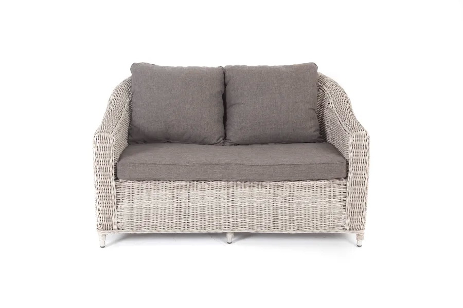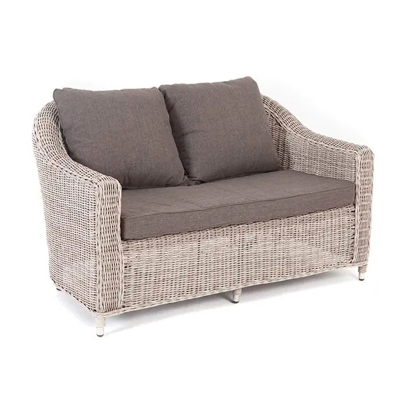 Двухместный диван «Кон Панна» с закругленной спинкой, переходящей в подлокотники. Изготовлен на основе алюминиевого каркаса, на который приходится основная нагрузка. Модель задекорирована практичной круглой оплеткой, сделанной из искусственного ротанга шоколадного оттенка. Комфортный диван укомплектован мягкими подушками. Съемные чехлы имеют серо-коричневый цвет. При их пошиве используется полиэстер с плотностью 230гр/м2. Его защитные свойства усиливаются благодаря влагоотталкивающей пропитке.
