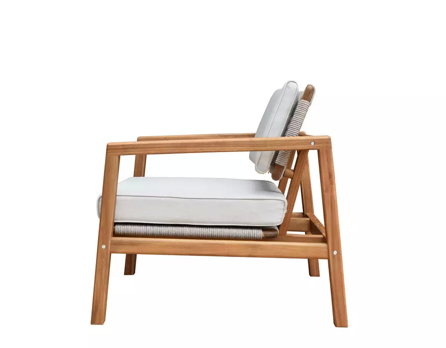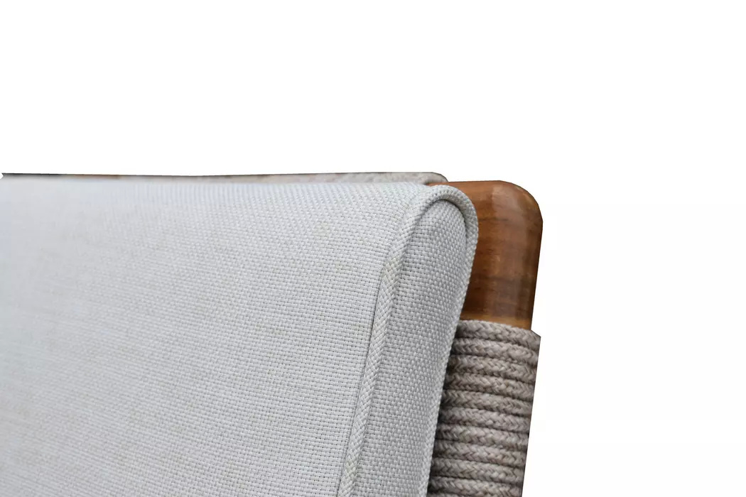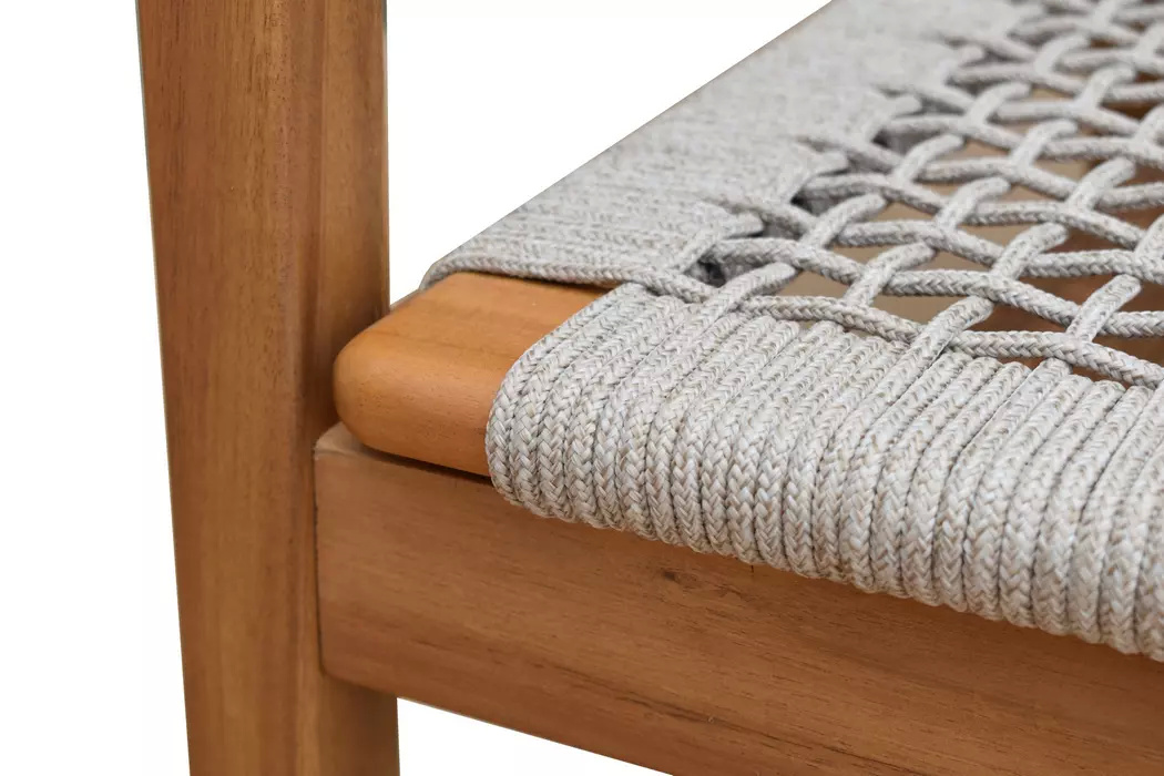 CALISTO – современная коллекция садовой мебели из акации, выполненная в комбинации натурального веревочного плетения роуп, массива акации и бежевых подушек.