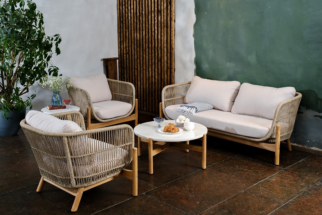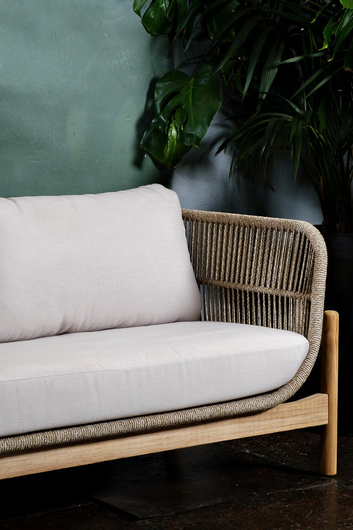 Материал — тик, отделка экомаслом светлый тик Веревочное плетение Rope, цвет плетения – бежевый Анодированная фурнитура из нержавеющей стали, каркас алюминий Подушки в комплекте, ткань подушек – Olefin, цвет бежевый лён.