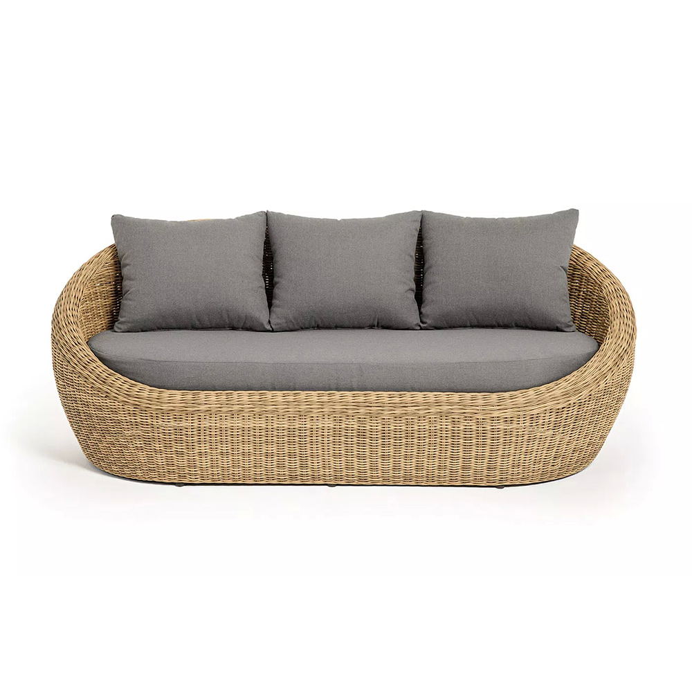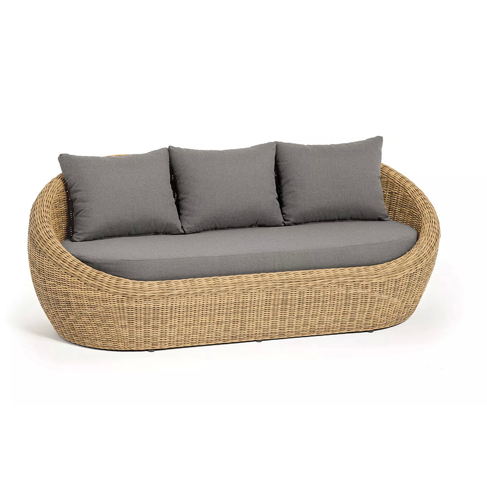 Трехместный диван дополняют мягкие подушки в сером цвете со съёмными чехлами. Тканевые изделия выполнены из прочного полиэстера плотностью 300гр/м2. Материал имеет влагоотталкивающую пропитку.