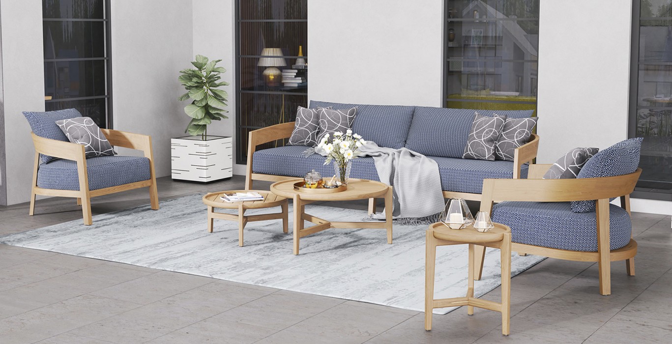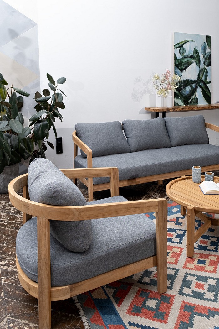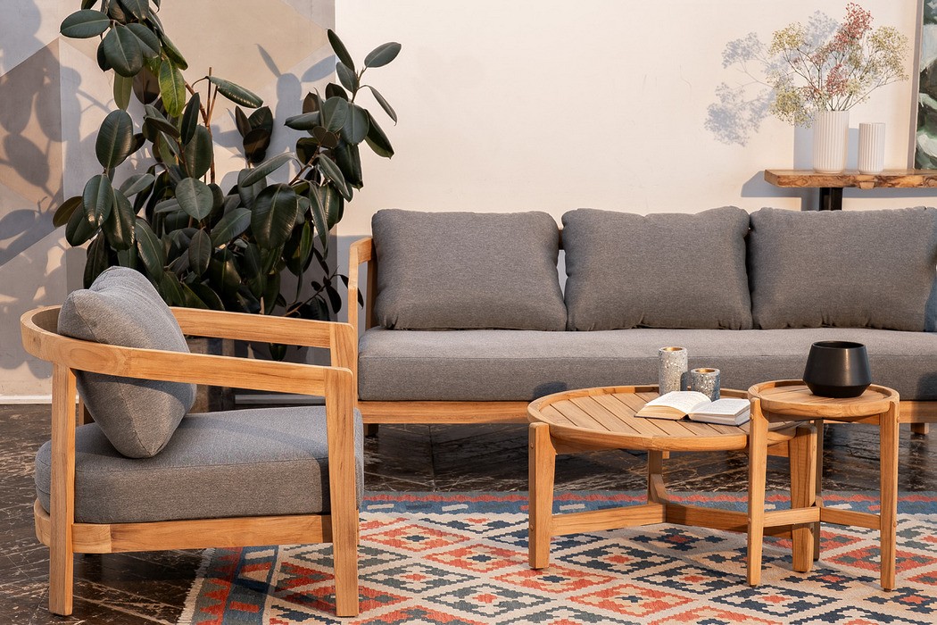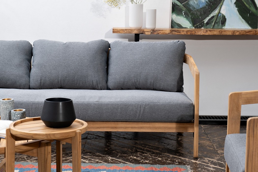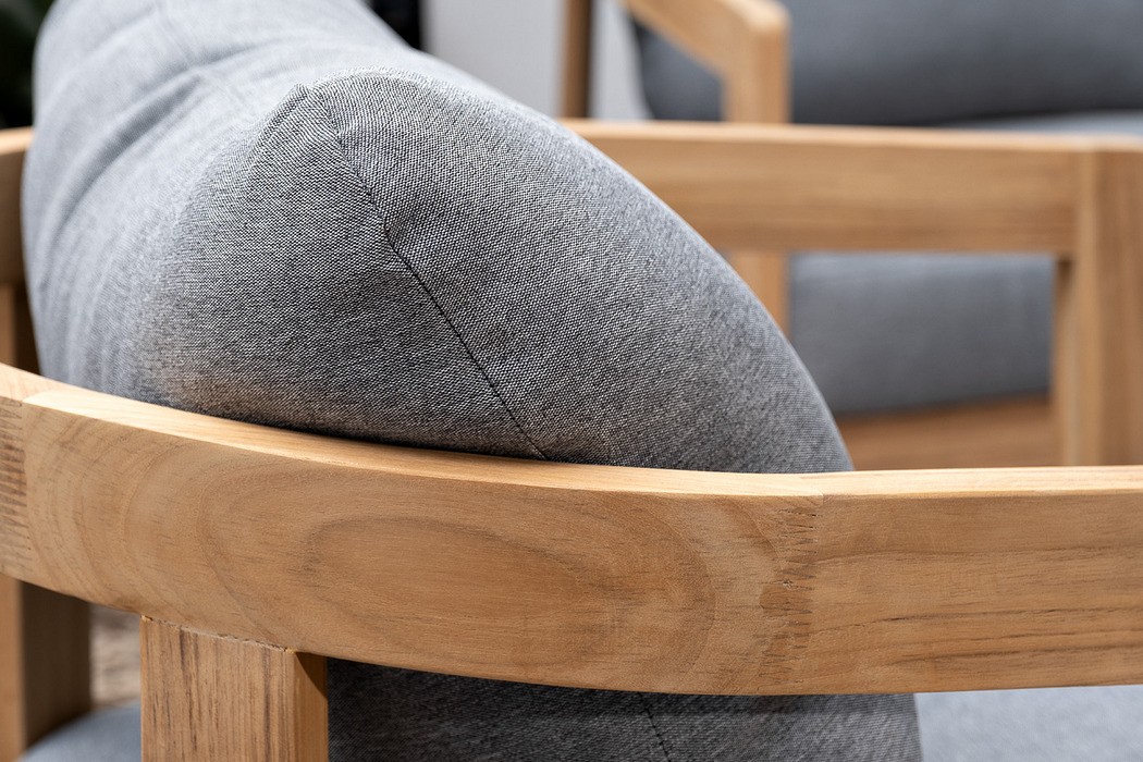 Материал массив тика, отделка экомаслом, цвет – натуральный тик. Анодированная фурнитура из нержавеющей стали. Подушки – ткань Olefin.