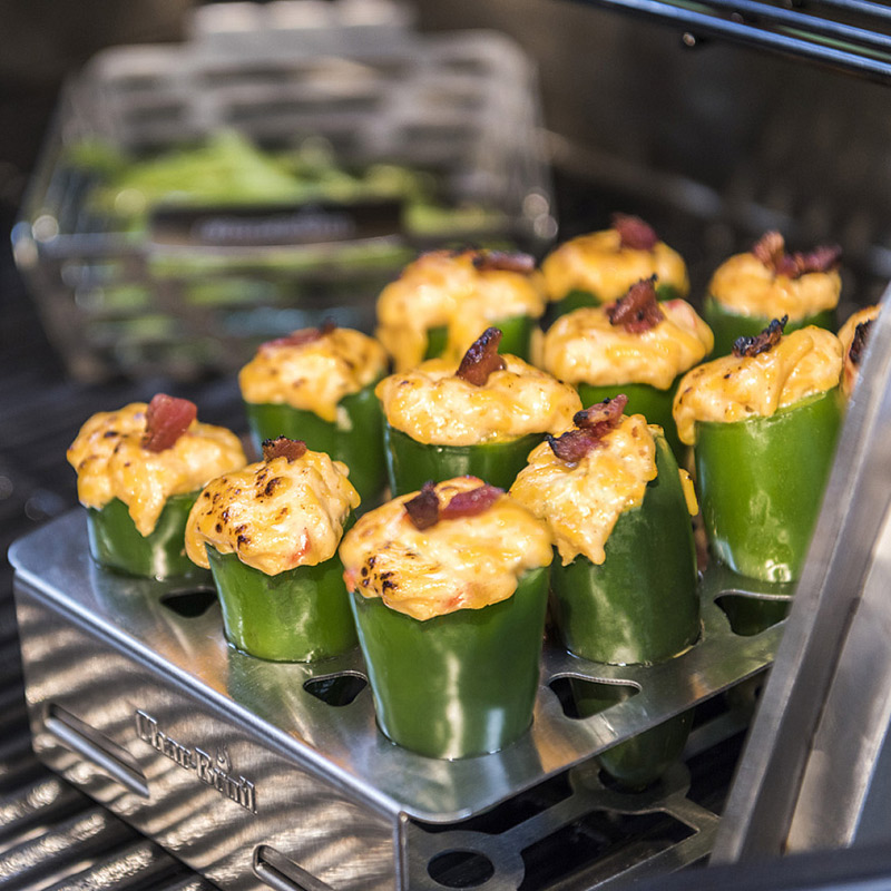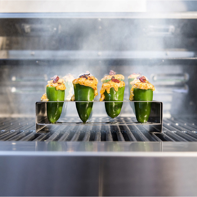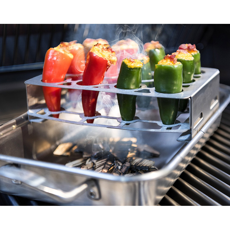 Двухуровневая металлическая подставка для жарки перчиков разного диаметра. Входит в фирменную систему аксессуаров Grill+.