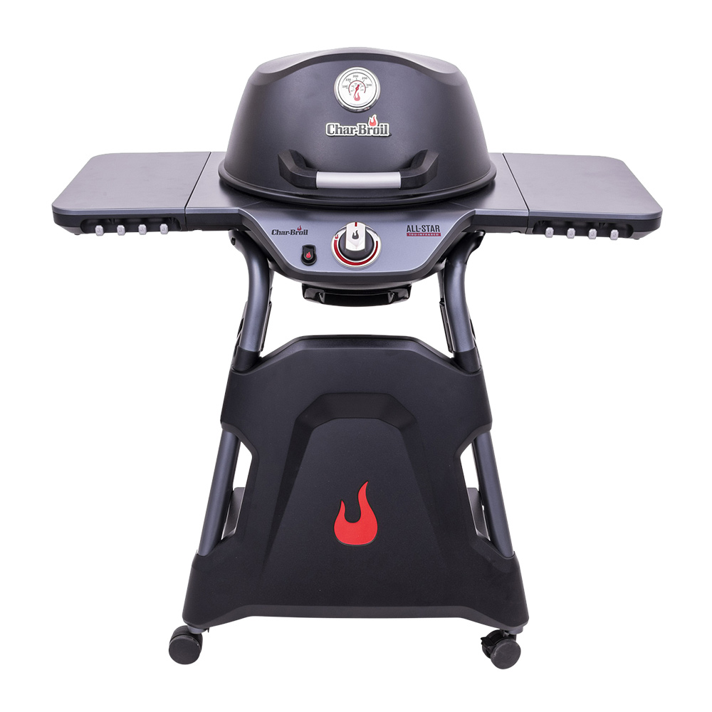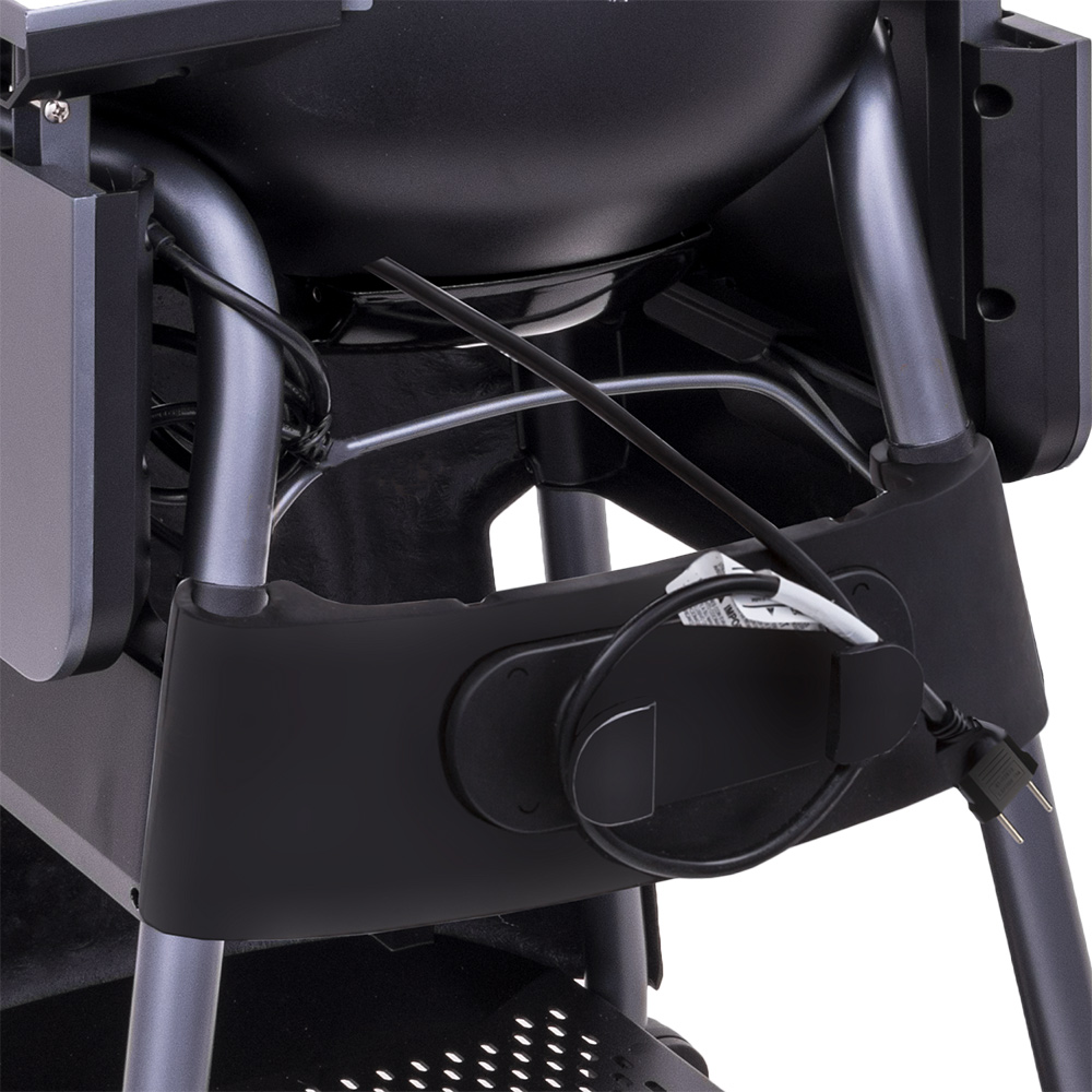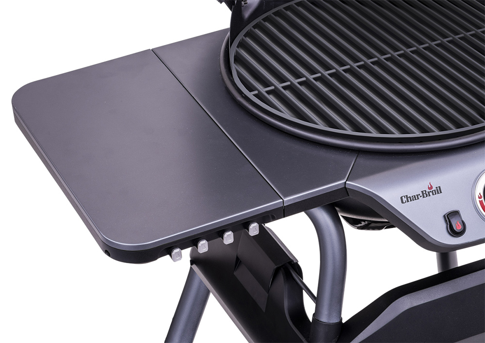 Для точного контроля температуры в центральную часть крышки встроен термометр, который позволяет отслеживать процесс приготовления без необходимости открывать гриль и терять тепло. Модель оснащена складными боковыми столиками со встроенными крючками, на которых удобно размещать инструменты, аксессуары и специи, а также подвешивать кухонное полотенце. Газовый баллон располагается под грилем и скрыт за декоративной панелью с логотипом производителя, благодаря чему пространство вокруг гриля остается аккуратным и визуально упорядоченным.