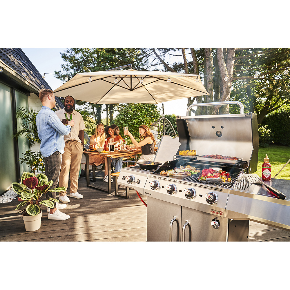 Новейший газовый гриль Performance PRO™ оснащается запатентованной инфракрасной пластиной TRU Infrared™, которая обеспечивает равномерный жар по всей решетке и предохраняет от вспышек капающего жира в котле. Эта сбалансированная модель среднего размера с четырьмя основными и дополнительной боковой горелками прекрасно подойдет для любой компании.