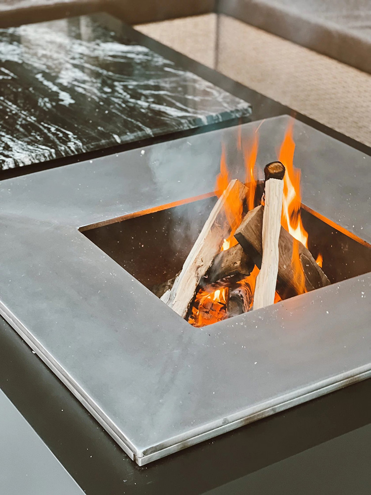 Может быть дополнительно укомплектовываться стеклом для защиты от искр, гриль решеткой, вместо торцевых камней может быть установлена раковина, ведерко со льдом, или разделочная доска.