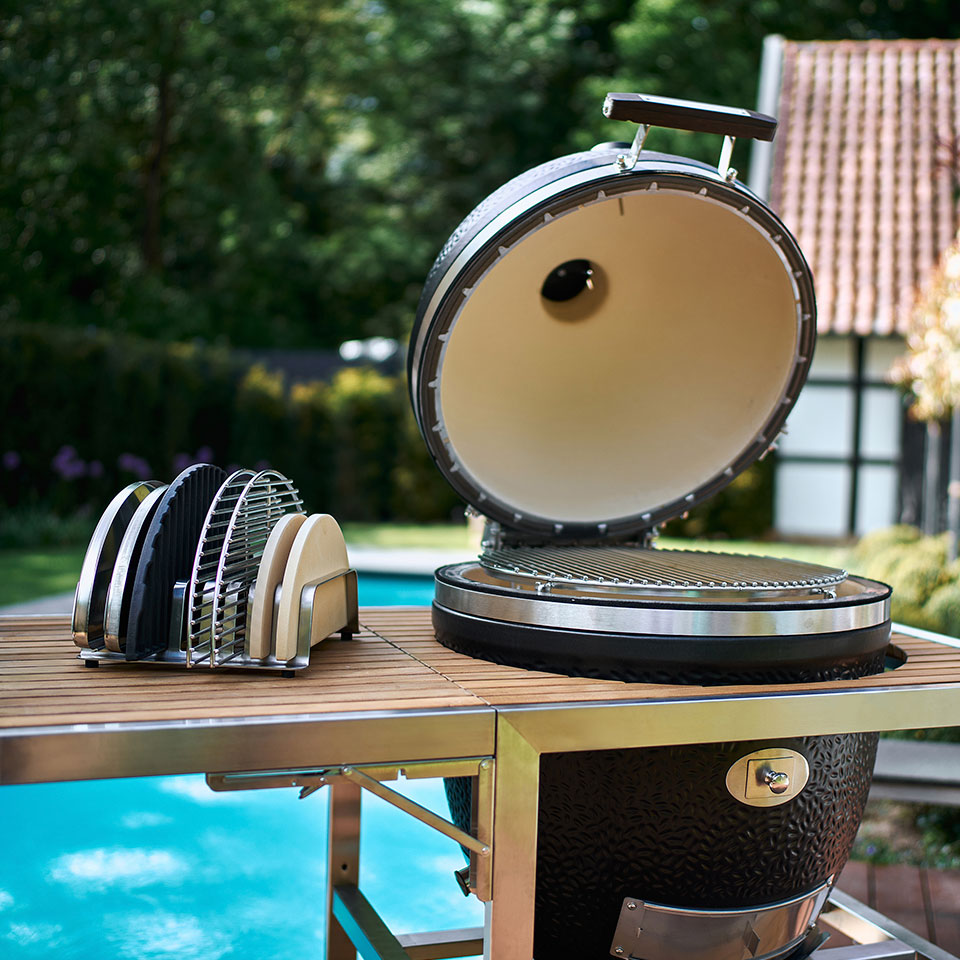 Дополнив свой гриль аксессуарами, такими как чугунная планча, камень для пиццы, сковорода-вок, вертел с электроприводом или большая стальная планча, вы превратите свой Classic в настоящую уличную кухню.
