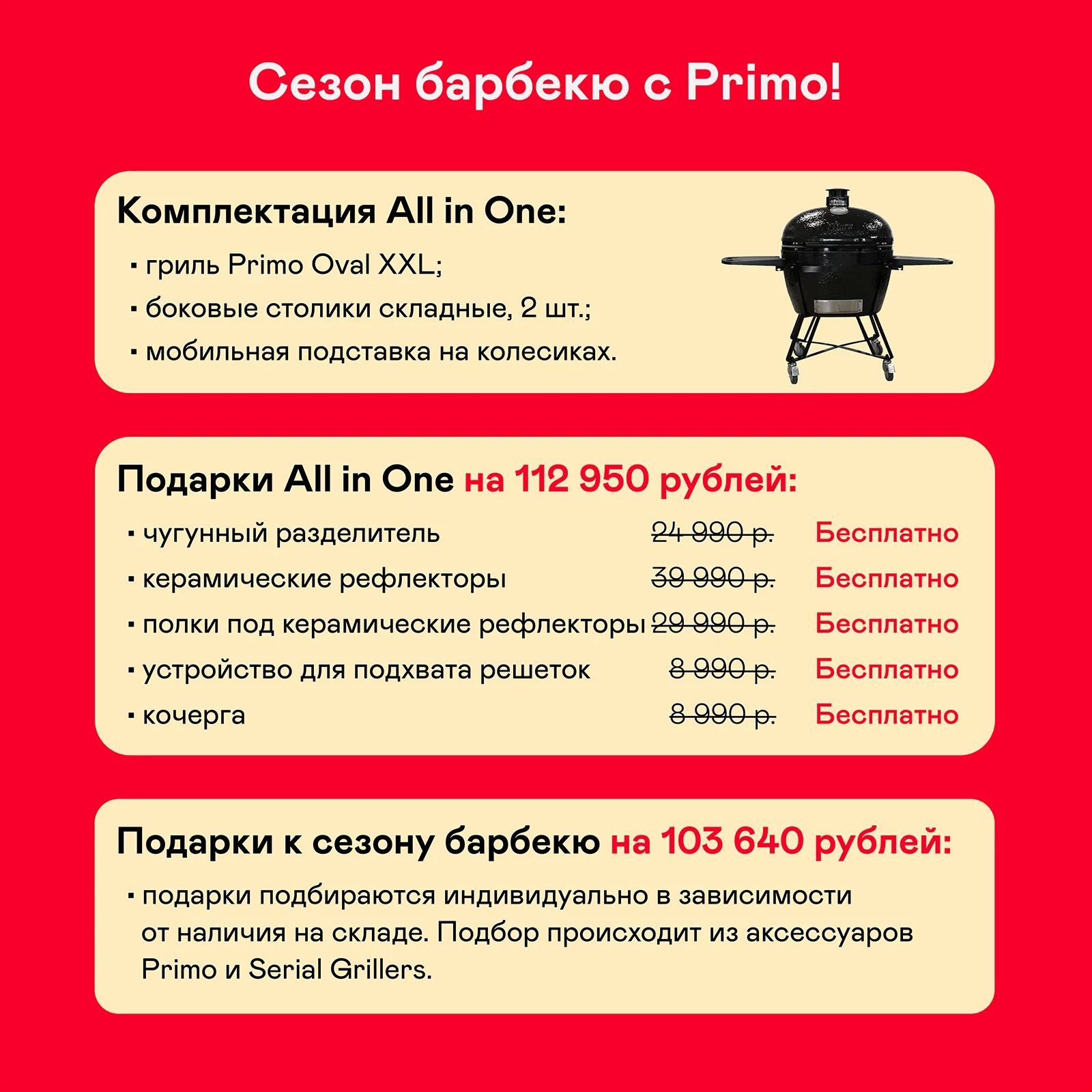 Комплектация All in One: мобильная подставка, боковые столики, чугунный разделитель, керамические рефлекторы, полки под рефлекторы, кочерга, устройство для подхвата решеток.