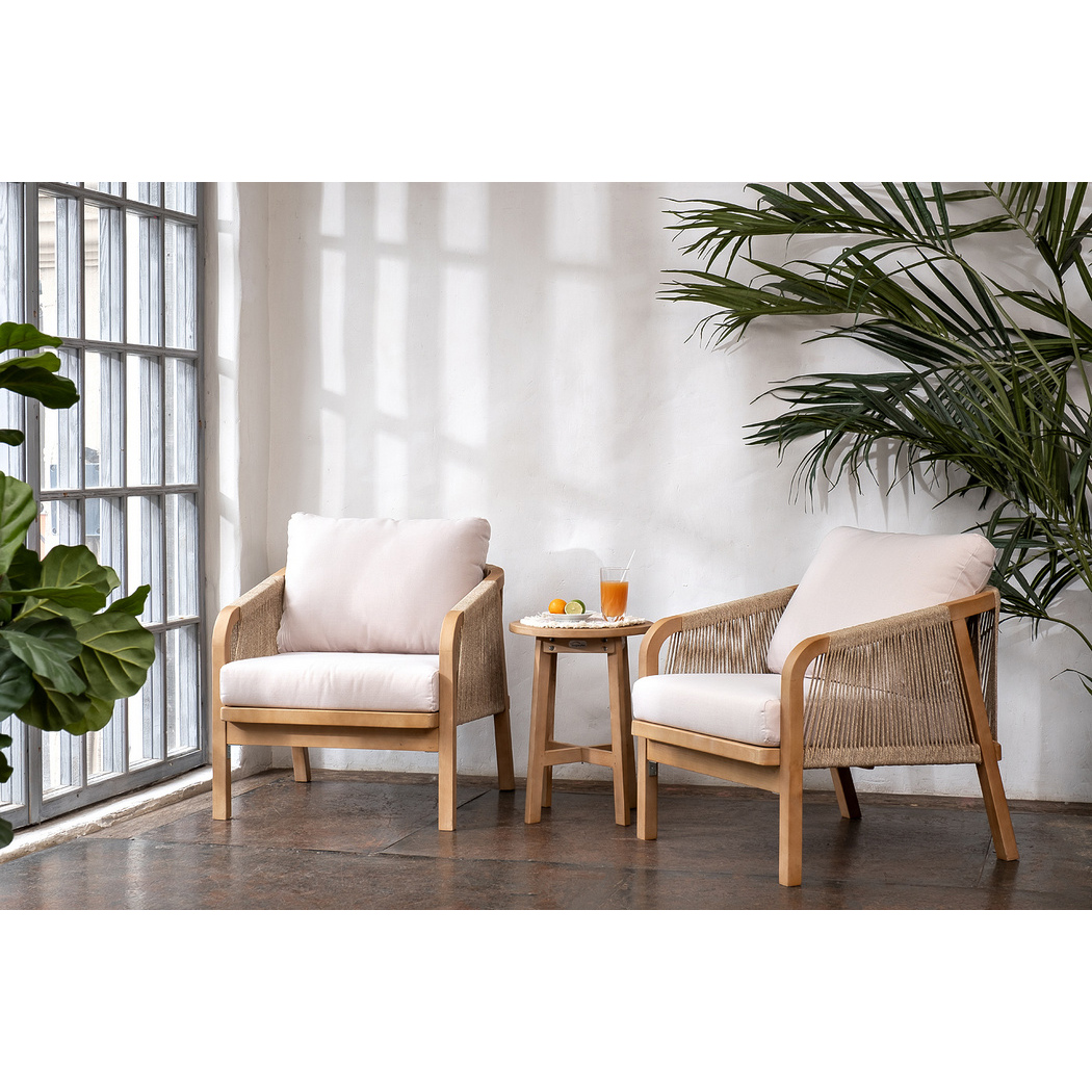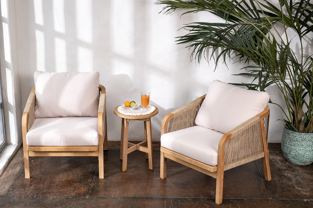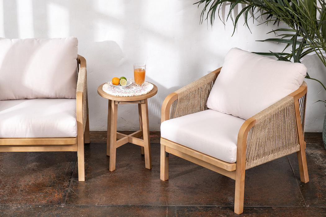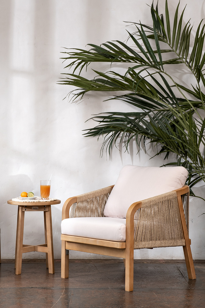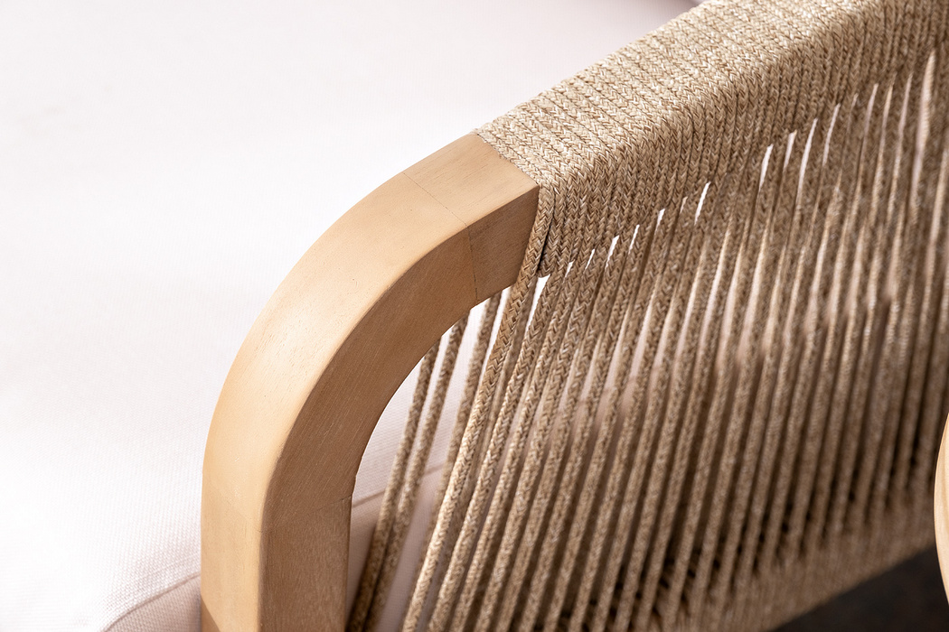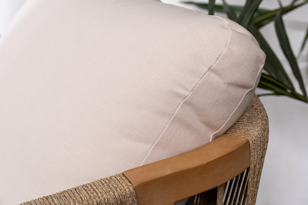RIMINI – современная коллекция садовой мебели из акации, выполненная в комбинации натурального веревочного плетения rope, массива акации и бежевых подушек.