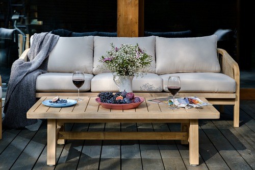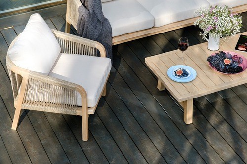 RIMINI – современная коллекция садовой мебели из акации, выполненная в комбинации натурального веревочного плетения rope, массива акации и бежевых подушек.