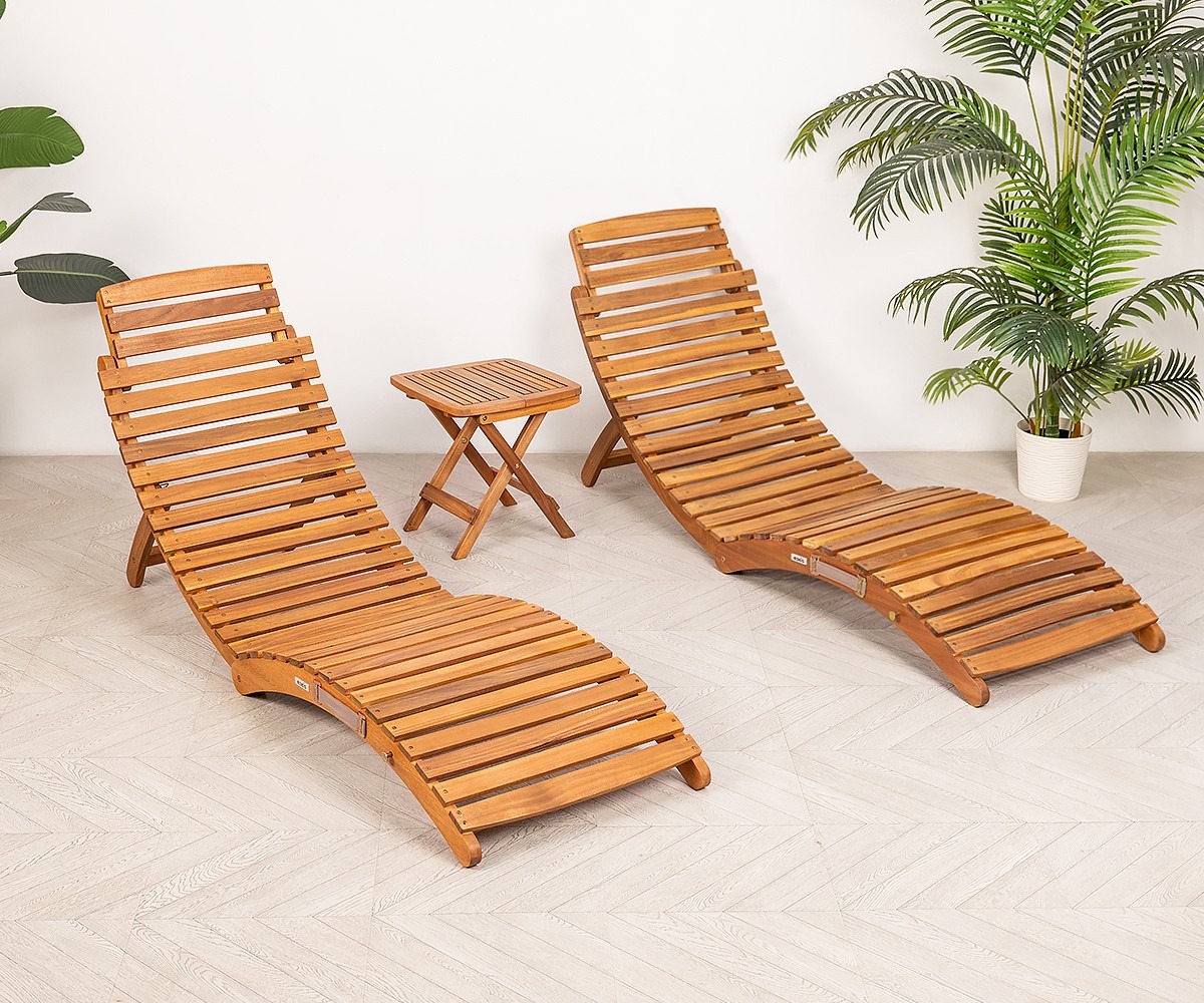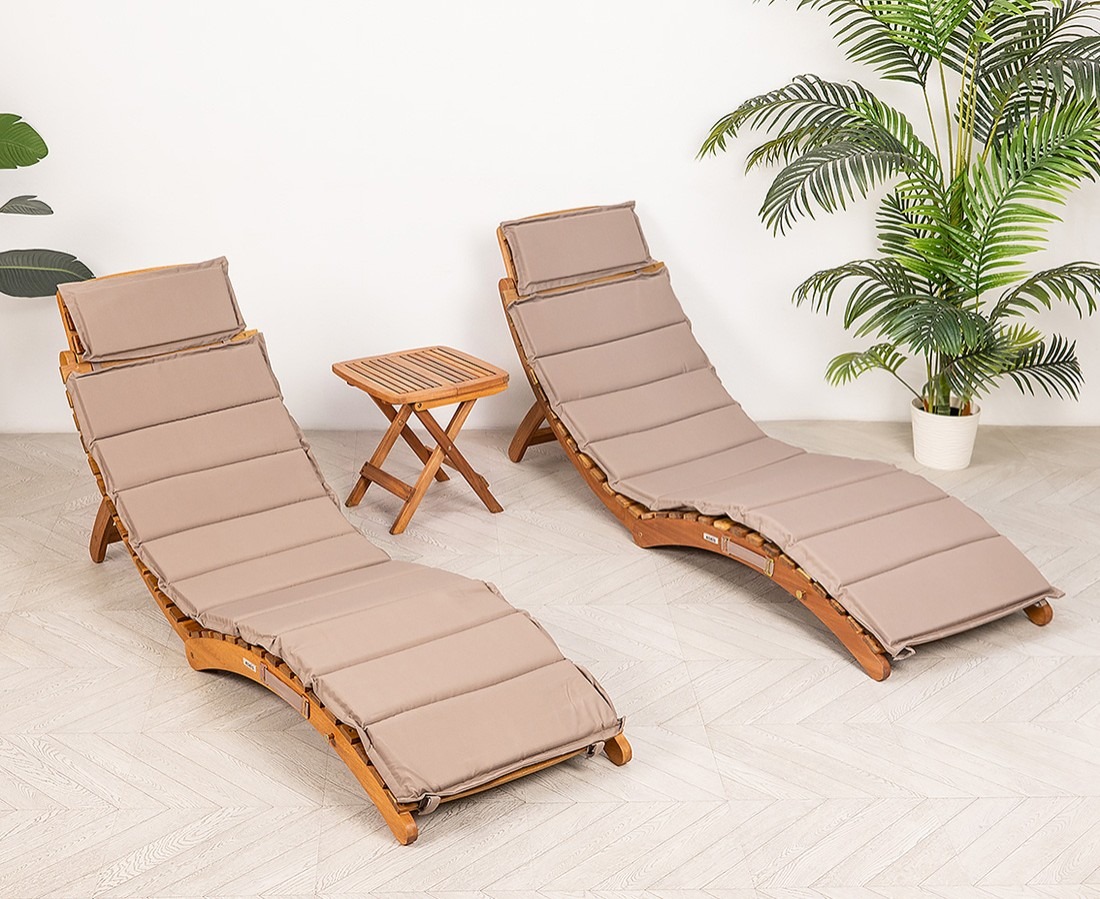 Комплект включает: два складных лежака (шезлонга) анатомической формы, два матраса с подголовниками, складной столик. Это уютное, красивое и практичное решение для принятия солнечных ванн на садовом участке или около бассейна.