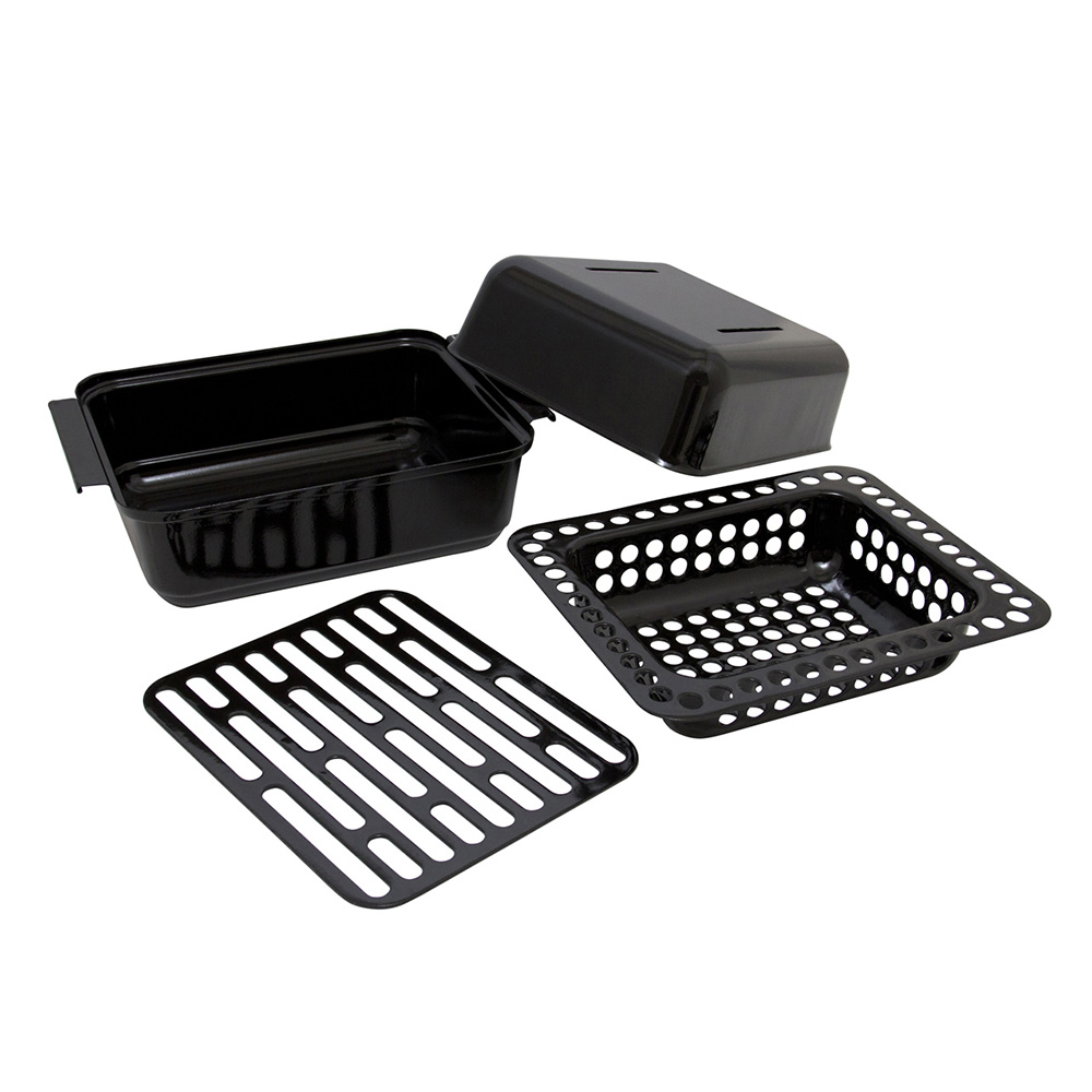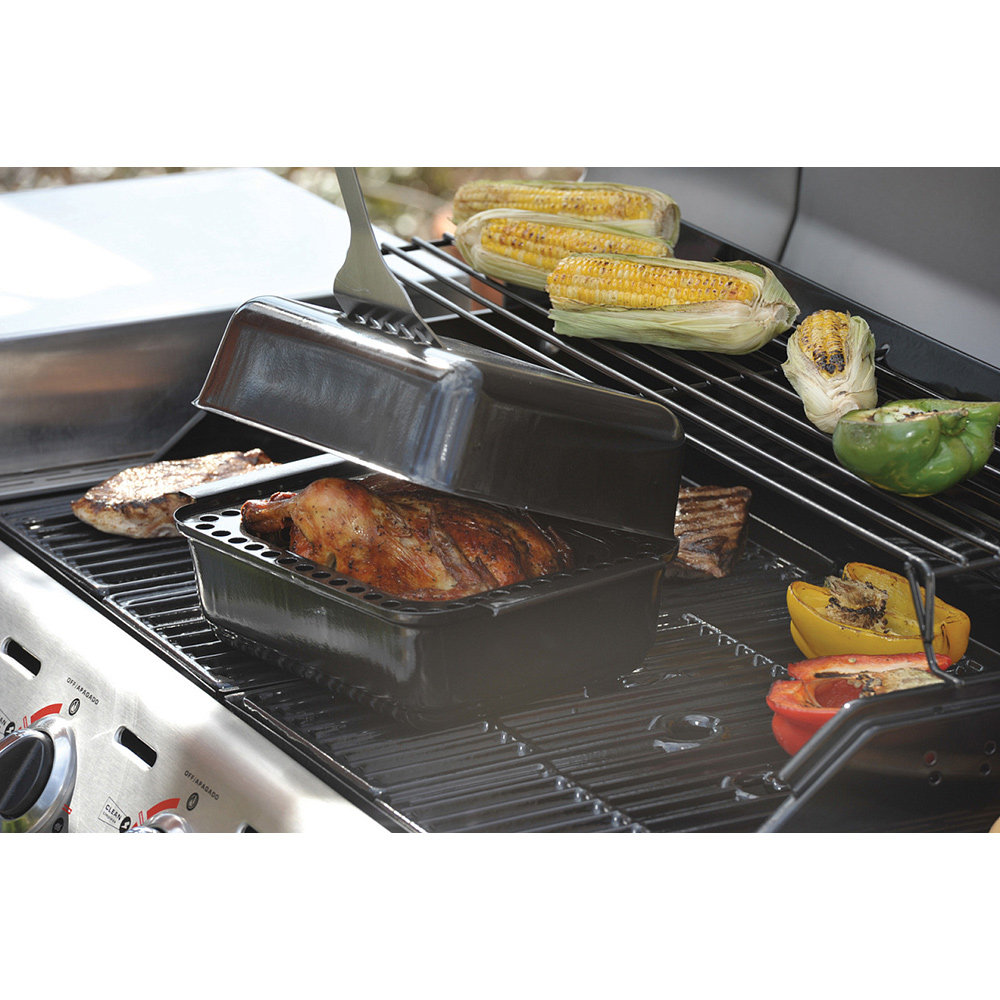 Компактный короб для запекания мяса и рыбы на гриле. Конструкция включает в себя поддон с высокими бортами, крышку для поддона, решетку гриль и перфорированный поддон. Размеров аксессуара достаточно, чтобы за один раз запечь крупную курицу.