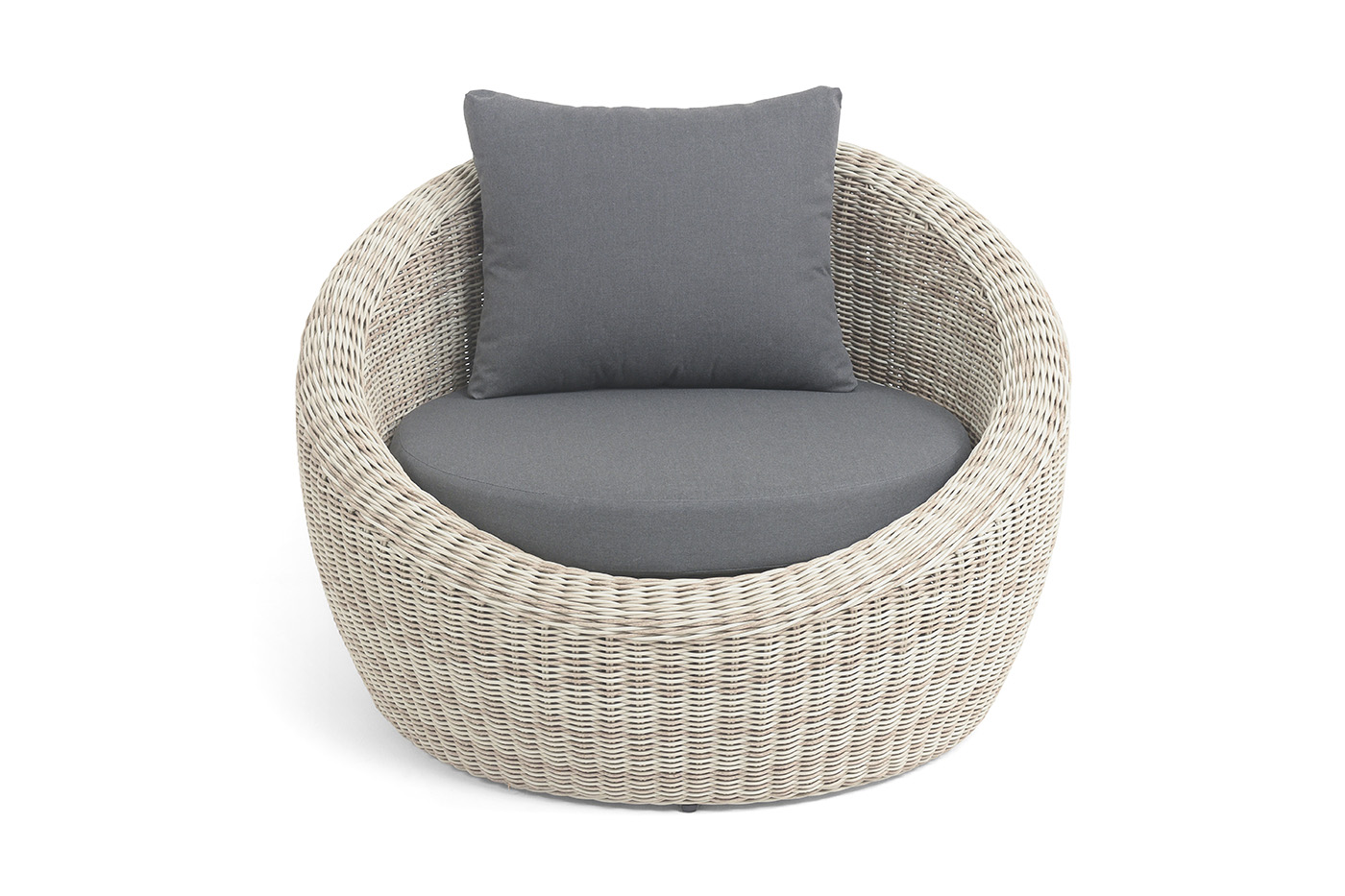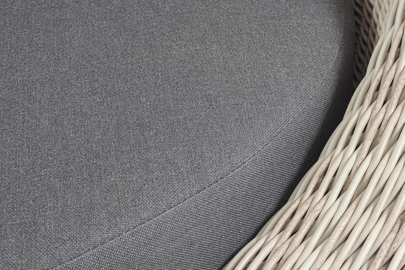 В комплекте с уличным ротанговым креслом идут мягкие подушки со съёмными чехлами серого оттенка. Они пошиты из полиэстера, который не боится повышенной влажности благодаря наличию влагоотталкивающей пропитки. Плотность ткани составляет 300гр/м2.
