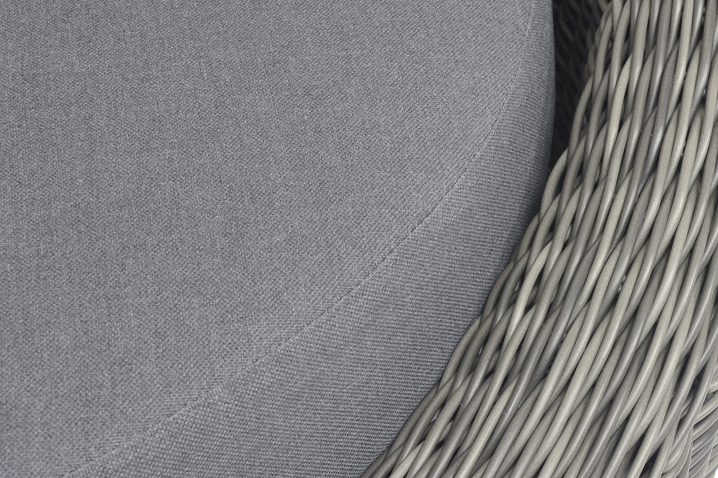 В комплекте с уличным ротанговым креслом идут мягкие подушки со съёмными чехлами серого оттенка. Они пошиты из полиэстера, который не боится повышенной влажности благодаря наличию влагоотталкивающей пропитки. Плотность ткани составляет 300гр/м2.