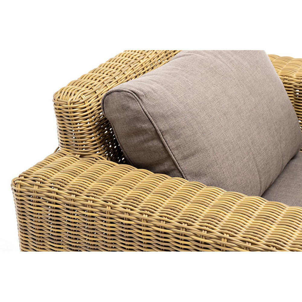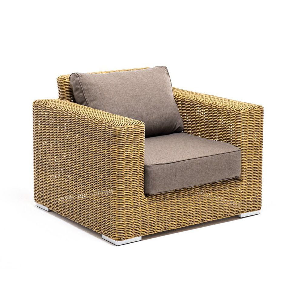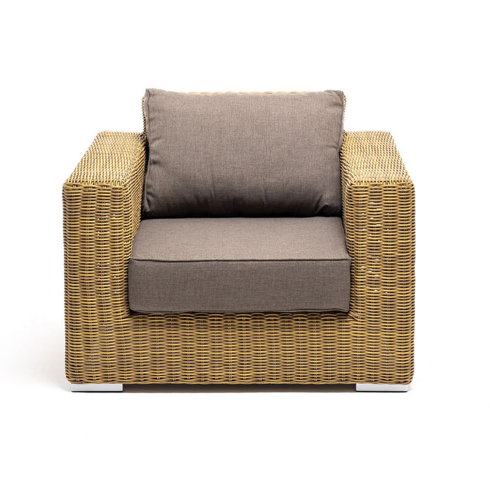 Кресло из искусственного ротанга «Боно» станет прекрасным дополнением к месту отдыха.Кресло оснащено каркасом из прочного алюминия, ручное круглое плетение является основным декоративным элементом мебели. Оно выполнено из искусственного ротанга в соломенном цвете.В комплектацию входят мягкие подушки для комфортного расположения. Чехлы съемные серо-коричневого цвета из высококлассного полиэстера с плотностью 230гр/м2. Габариты модели составляют 1000×900×775 мм, толщина подушки: 150 мм, вес: 23 кг.
