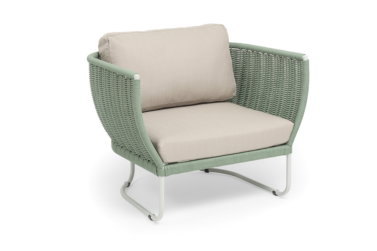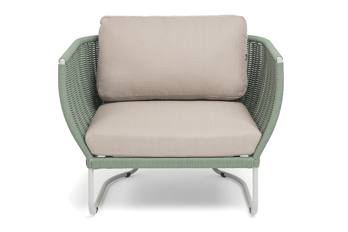 Боковины каркаса вручную оплетены роупом — эластичными синтетическими лентами из высокопрочных полиэфирных волокон. Оплетка - круглый tex, что придает креслу изысканный и оригинальный внешний вид.