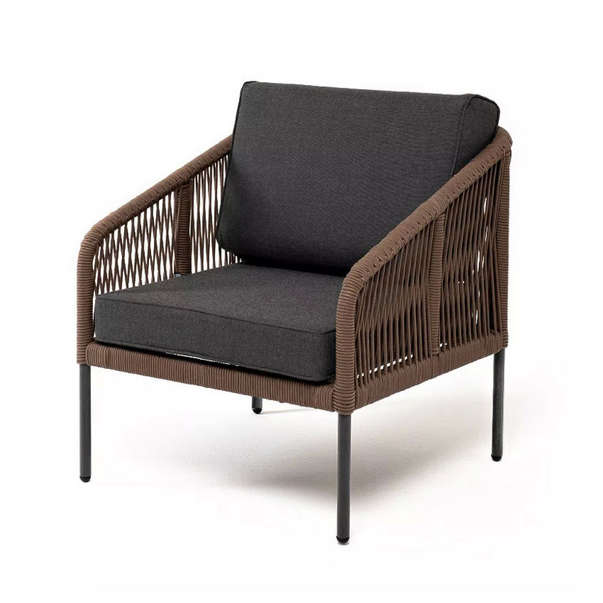 Кресло «Канны» из роупа идеально подходит для комфортного отдыха в саду или на веранде.На боковинах - оплетка из синтетических лент, выполненных из полиэфирных волокон высокой прочности. Цвет плетения - темно-серый (RAL7024).Приятное дополнение − подушки со съёмными чехлами темно-серого цвета.