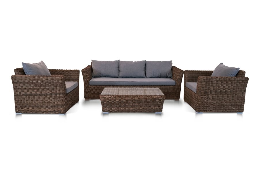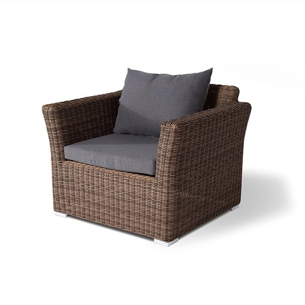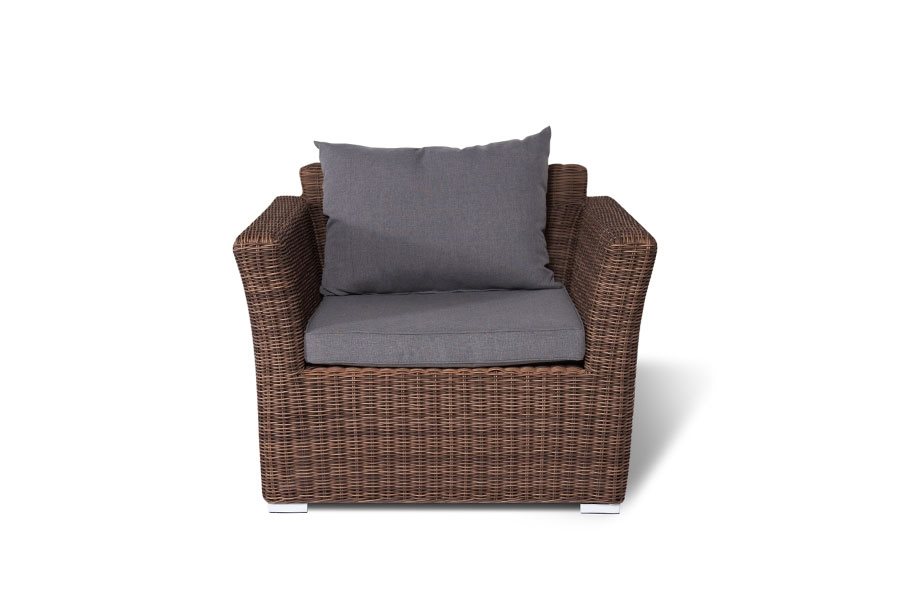 Кресло «Капучино» является практичным дополнением зоны отдыха, обустроенной мебелью из этой же серии. Размер модели – 1050 х 850 х 810 мм. Ее отличает алюминиевый каркас высокой прочности. В качестве декоративной составляющей выступает ручное плетение на основе искусственного ротанга. Оно выполнено в коричневом оттенке.