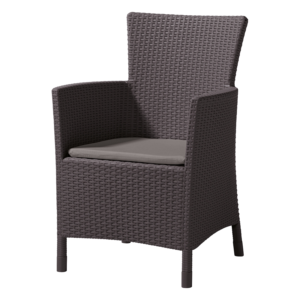 Iowa - это элегантное и комфортное садовое кресло, предлагаемое в комплекте с подушкой. Широкая гамма цветов и оригинальная, подобная ротанговой, фактура поверхности придется по вкусу даже самым требовательным пользователям. Изготовлено из стойкой к воздействию УФ-излучения и погодных условий высококачественной пластмассы. Очень просто собирается и легко чистится.