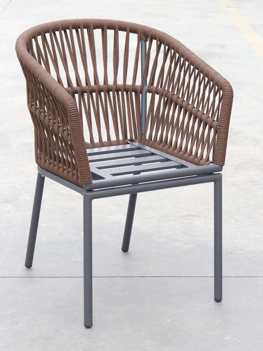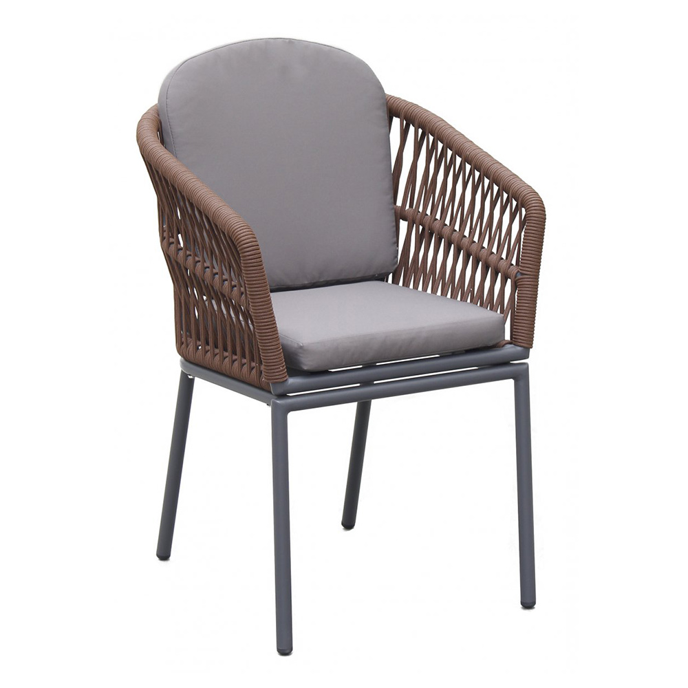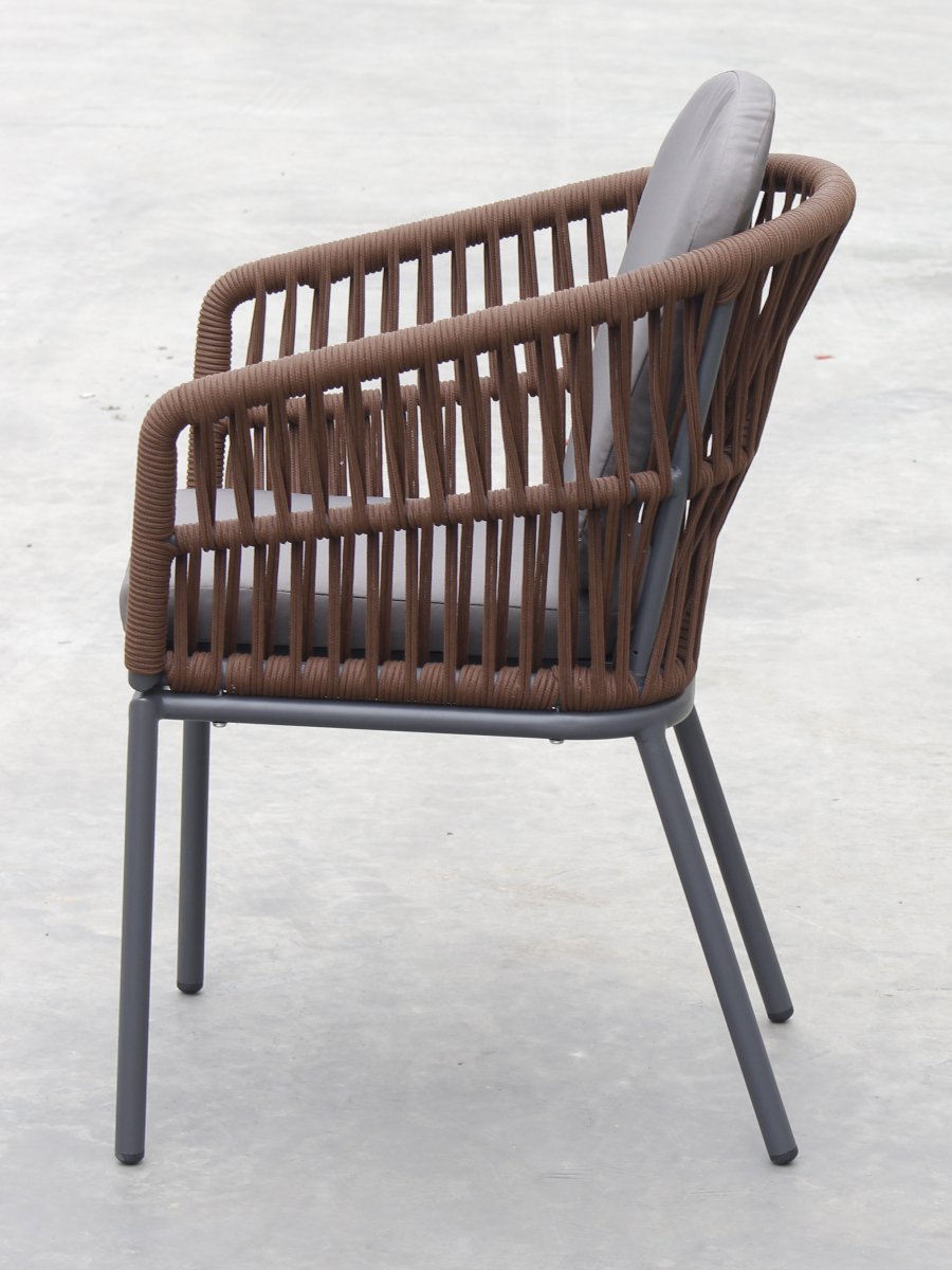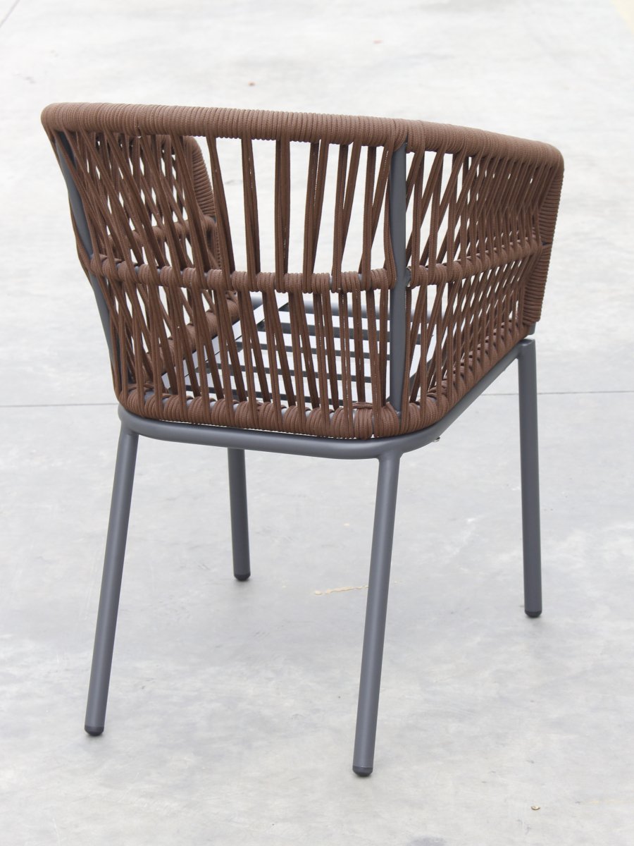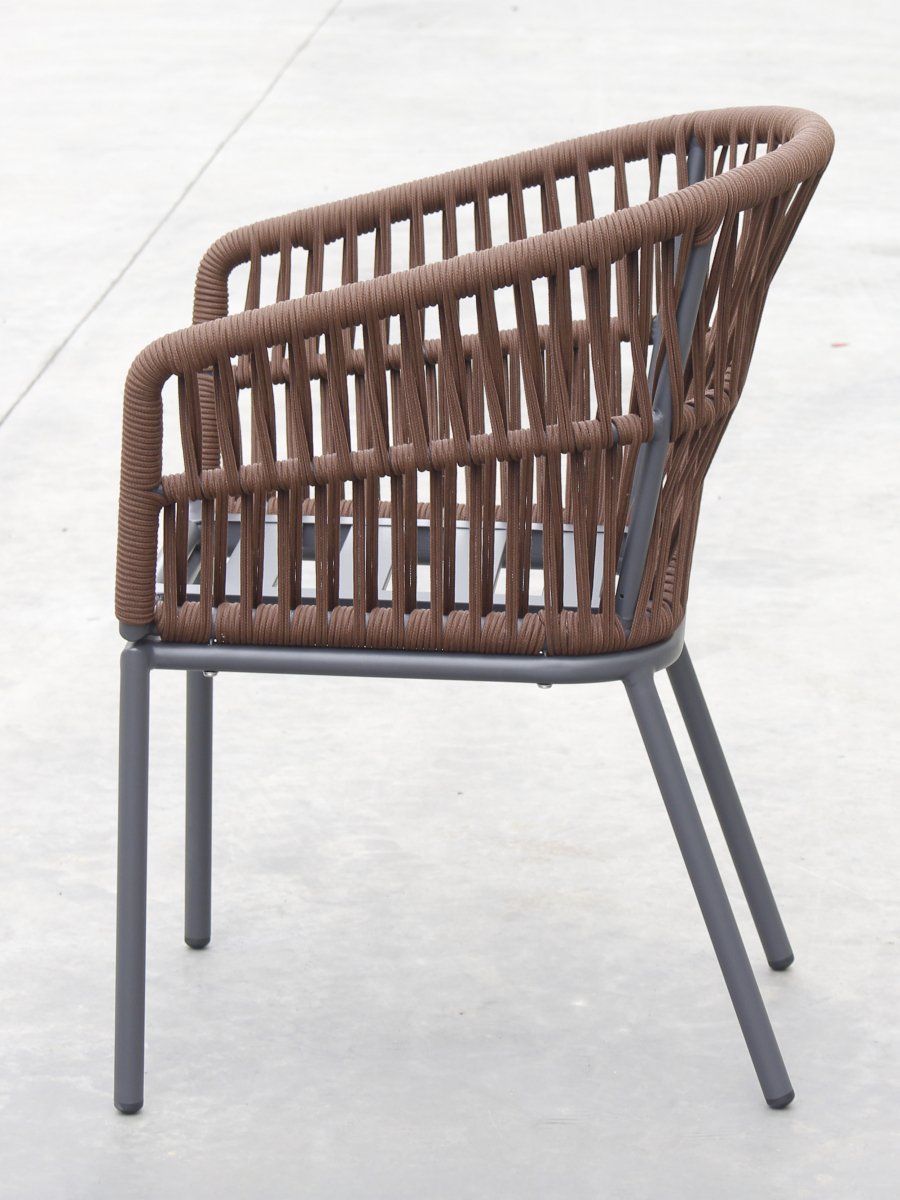 Спинка кресла выполнена из плетения веревки (роуп). Материал - олефин темно-коричневого (CHD6-13) цвета. Как и другие синтетические материалы, роуп рассчитан на любые погодные условия, и его можно оставлять на улице круглый год.
