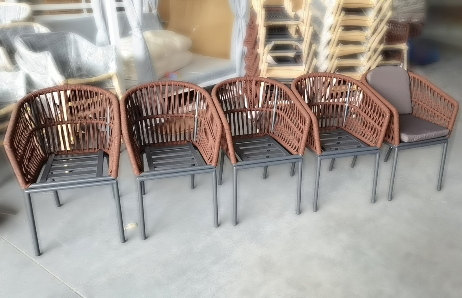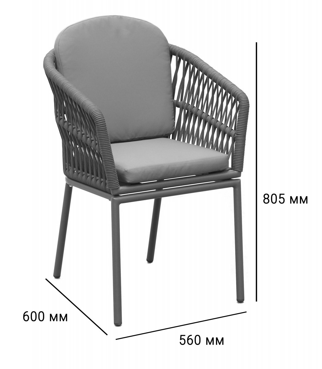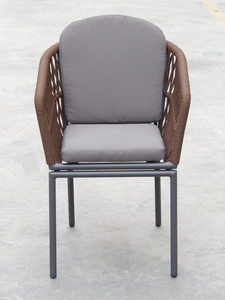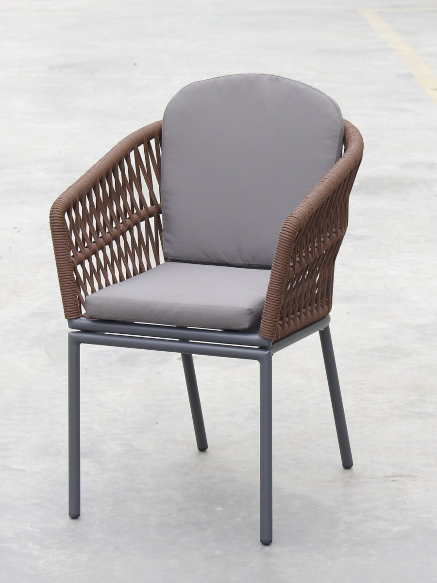 Спинка кресла выполнена из плетения веревки (роуп). Материал - олефин темно-коричневого (CHD6-13) цвета. Как и другие синтетические материалы, роуп рассчитан на любые погодные условия, и его можно оставлять на улице круглый год.