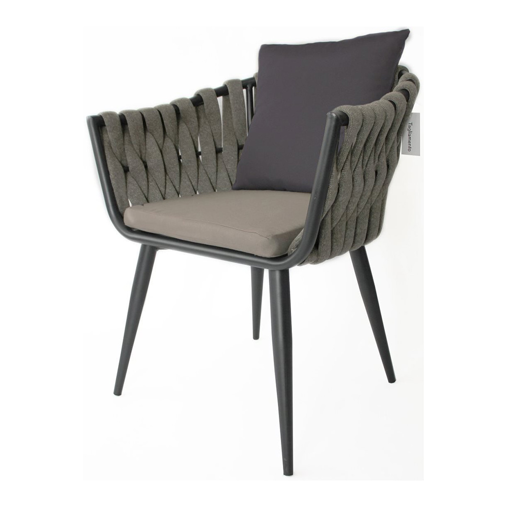 Уличное кресло с эргономичным и современным дизайном с алюминиевым каркасом и спинкой в плетении из роупа. Модель подходит для открытой террасы бара, ресторана, отеля или небольшого частного зимнего сада.