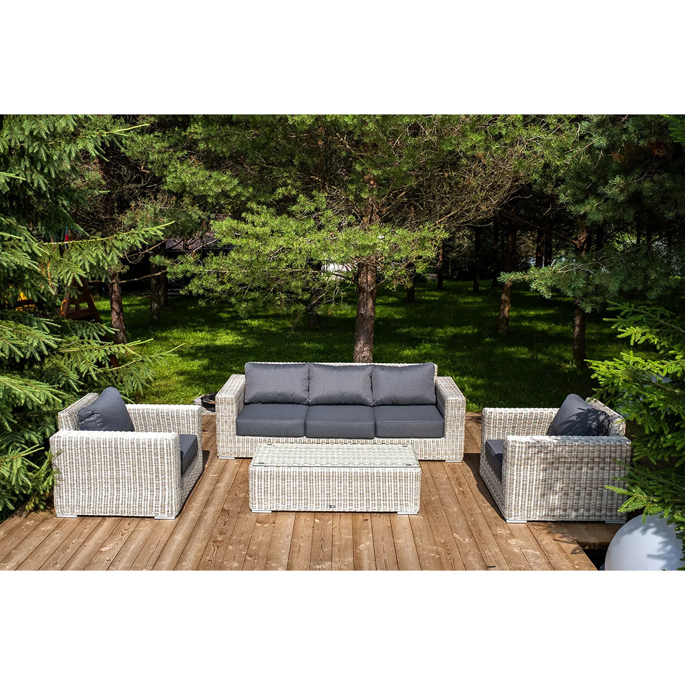 На креслах и диване предусмотрены мягкие подушки, съёмные чехлы которых пошиты из полиэстера, плотностью 300гр/м2. Ткань в обязательном порядке пропитывается влагоотталкивающими составами.