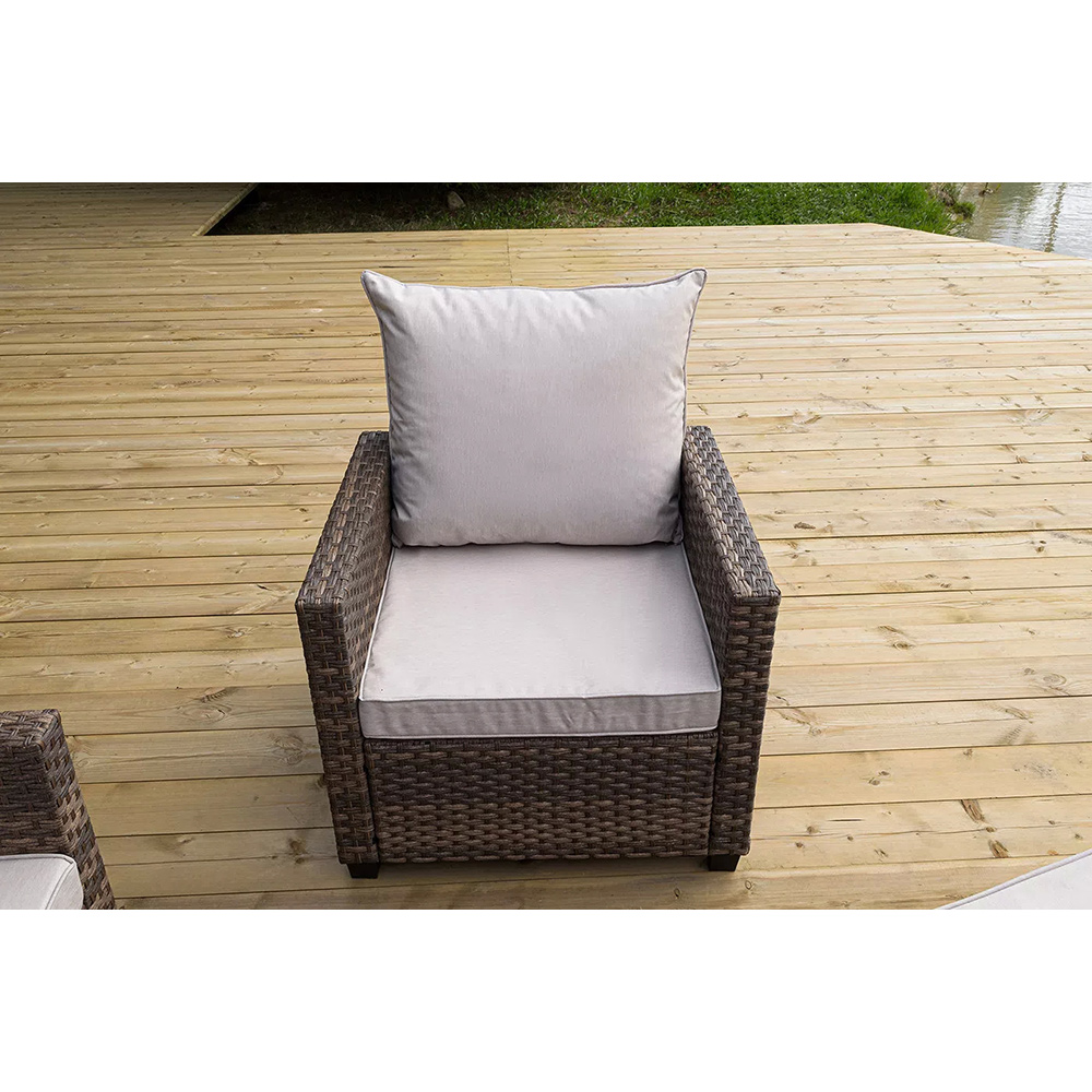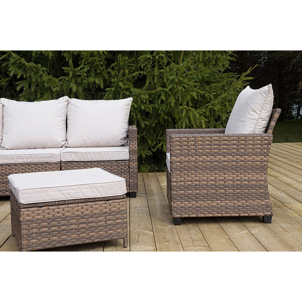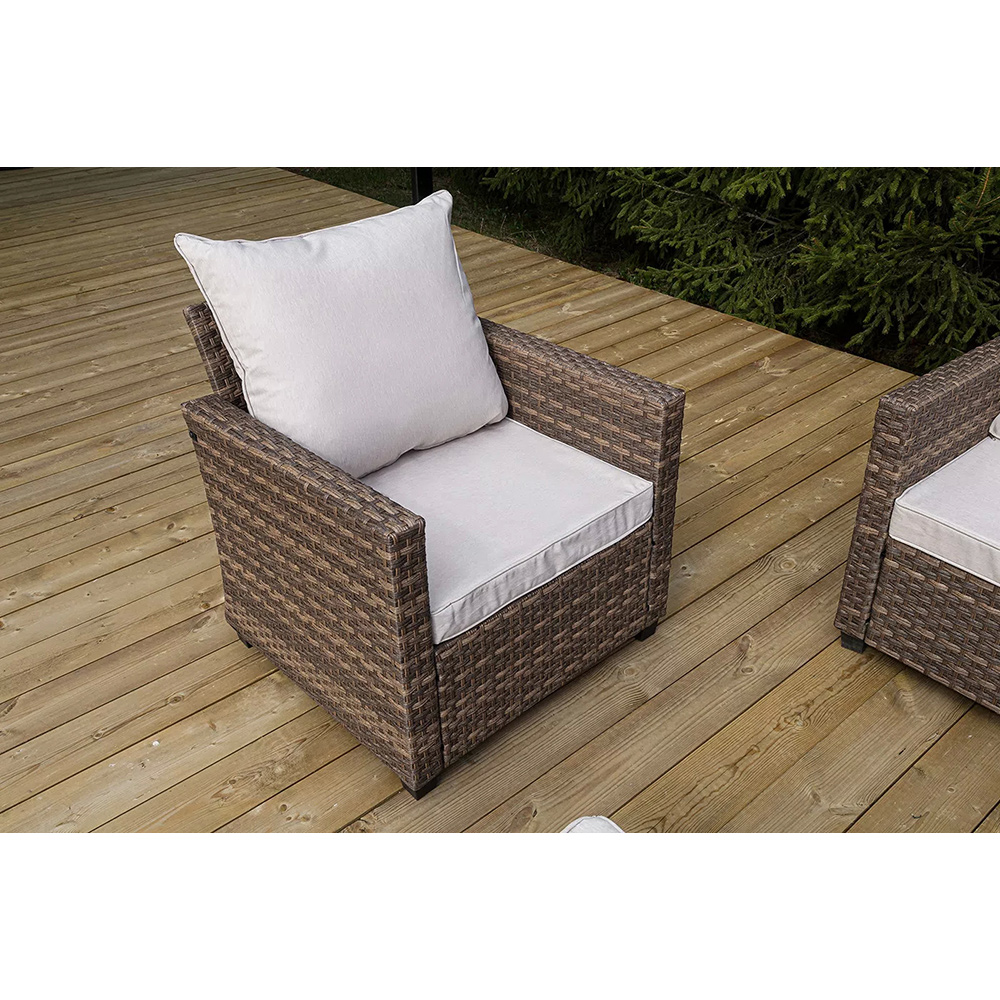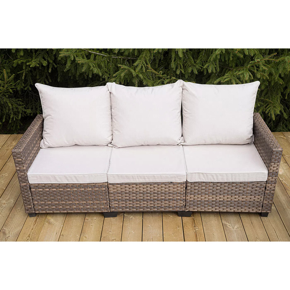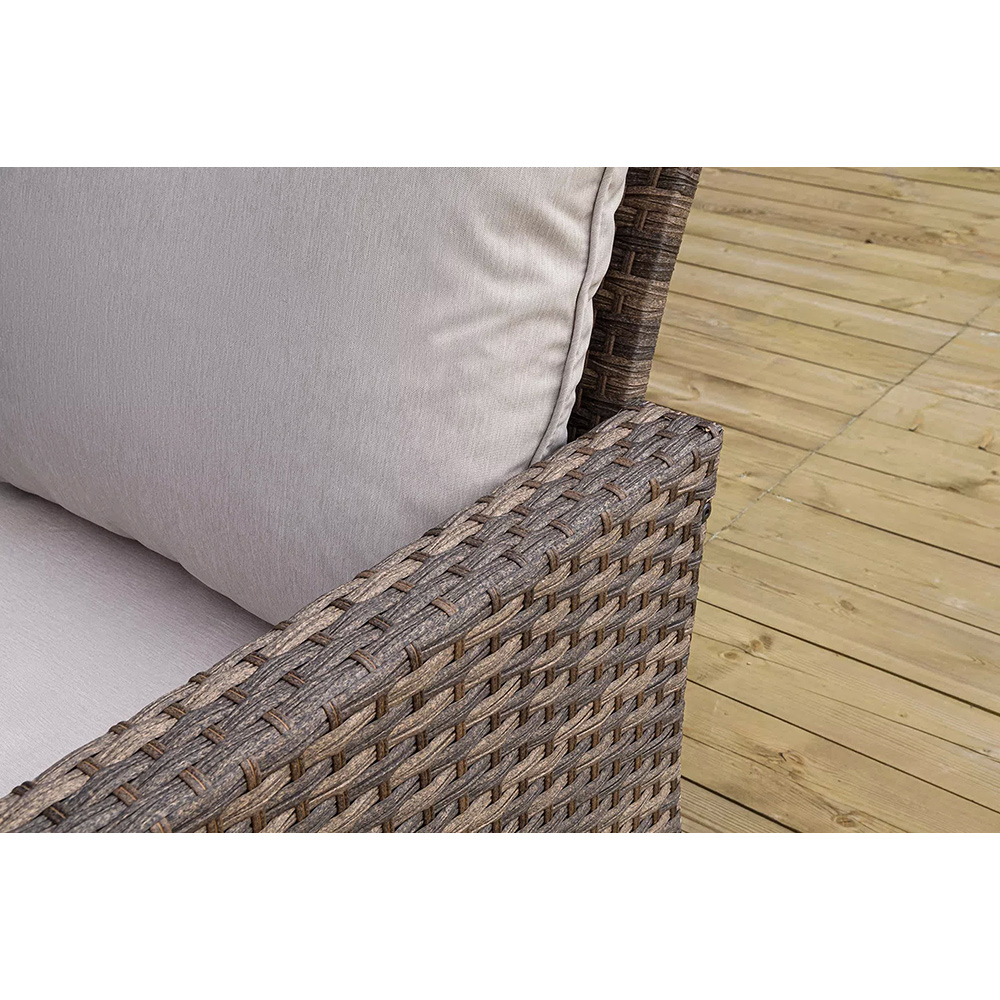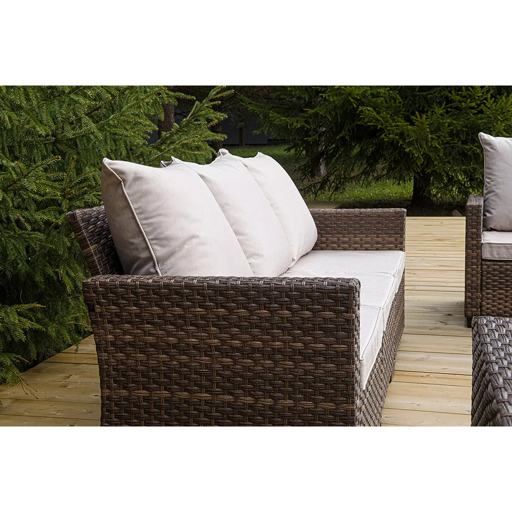 Плетеная мебель дополнена удобными подушками в бежевых чехлах. При их изготовлении используют полиэстер, плотность – 230гр/м2.