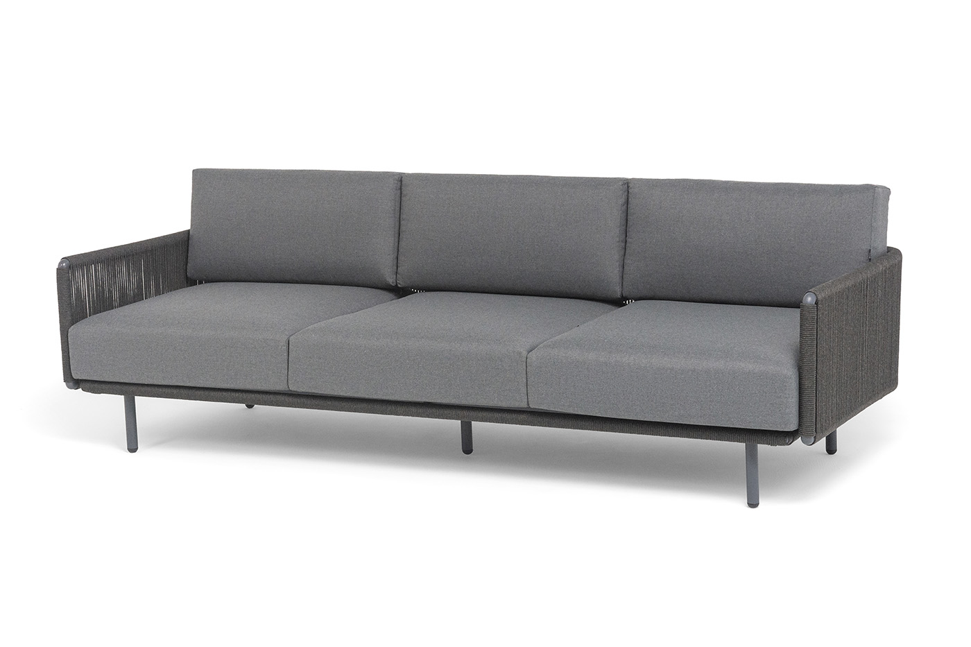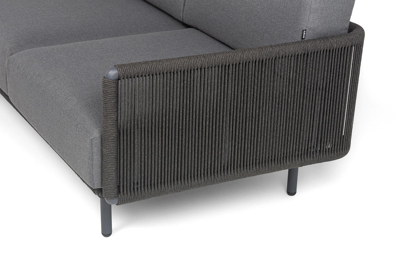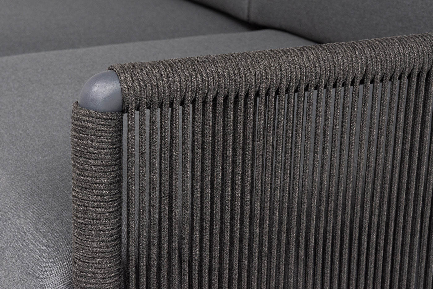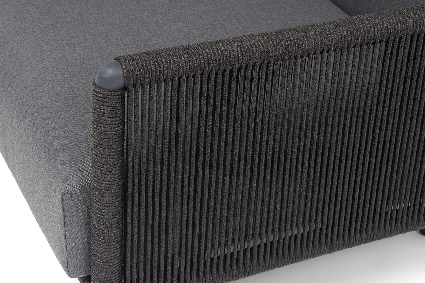 Каркас уличной мебели выполнен из износостойкого алюминия. Его дополняет темно-серая ручная оплетка, изготовленная на основе эластичных синтетических лент из полиэфирных волокон высокой прочности (роупа).