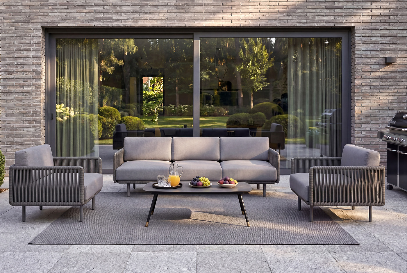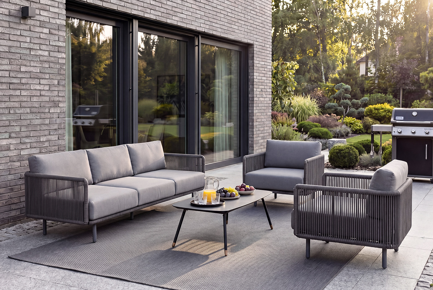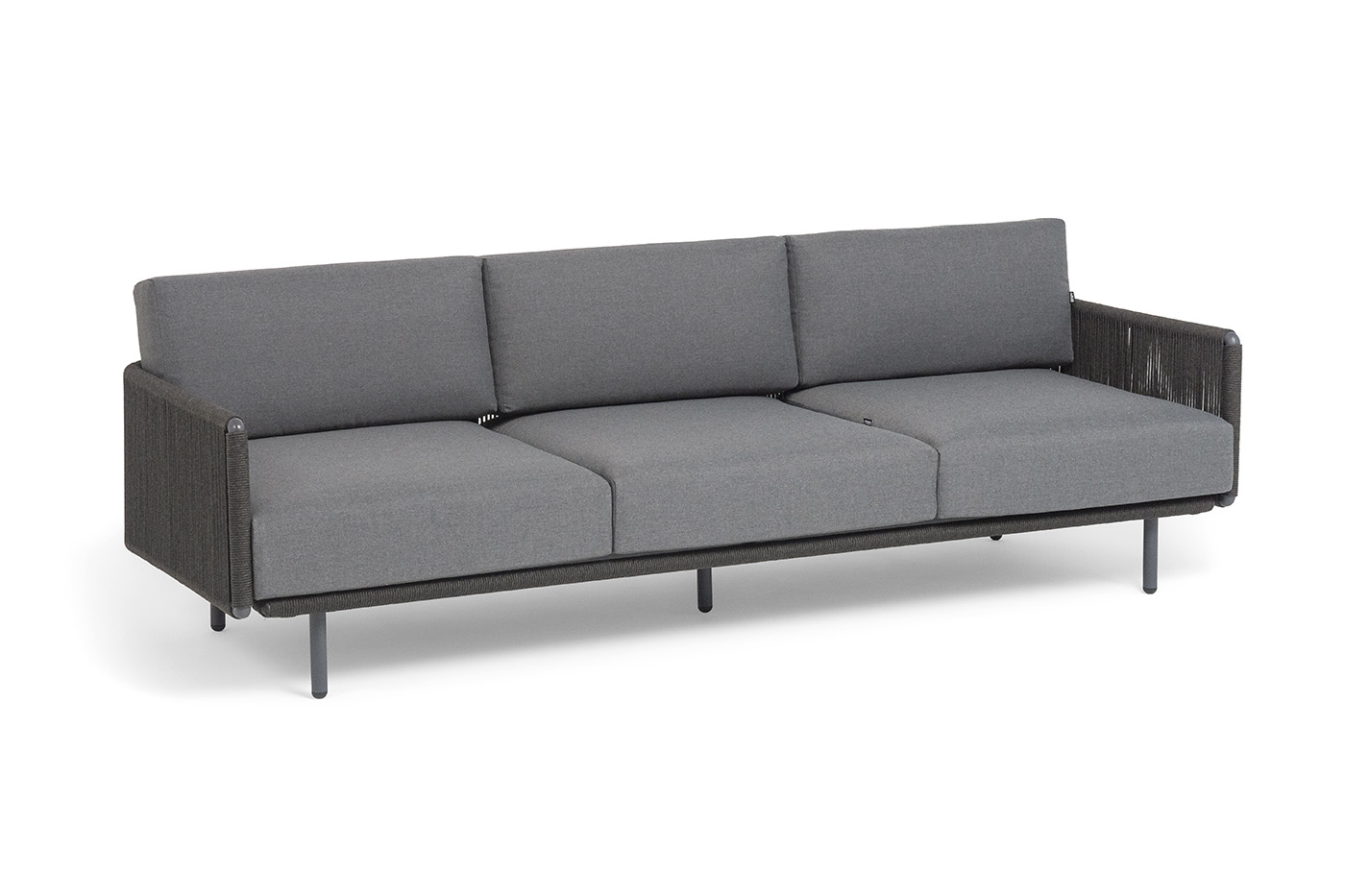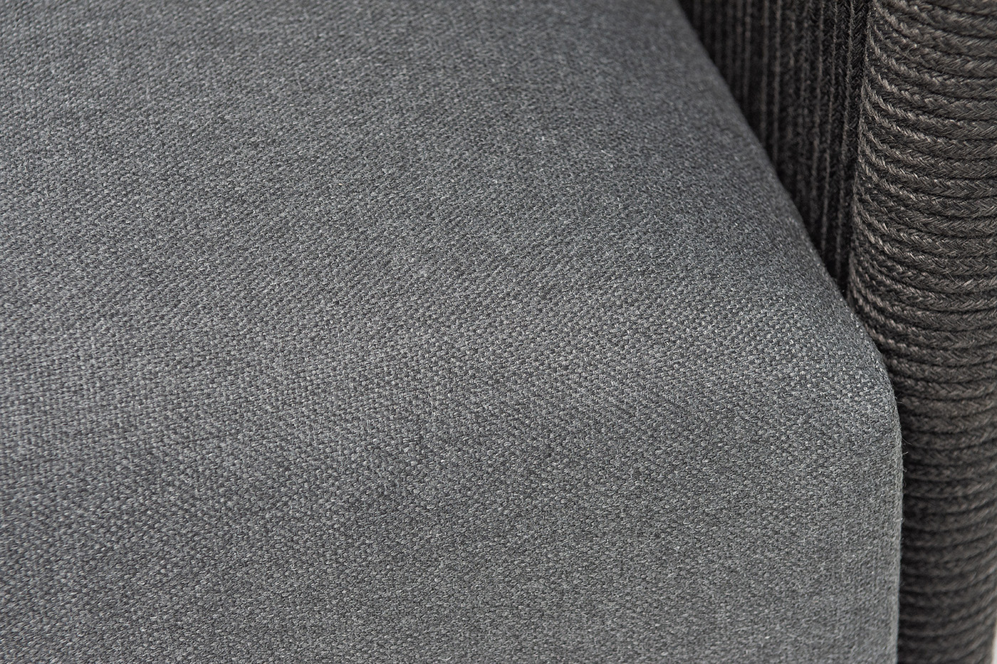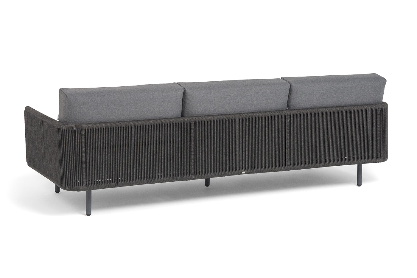Каркас уличной мебели выполнен из износостойкого алюминия. Его дополняет темно-серая ручная оплетка, изготовленная на основе эластичных синтетических лент из полиэфирных волокон высокой прочности (роупа).