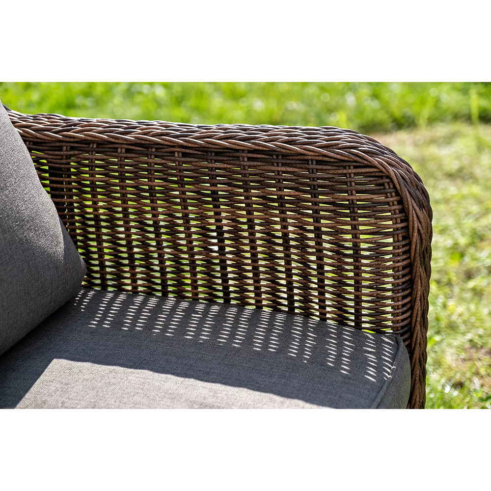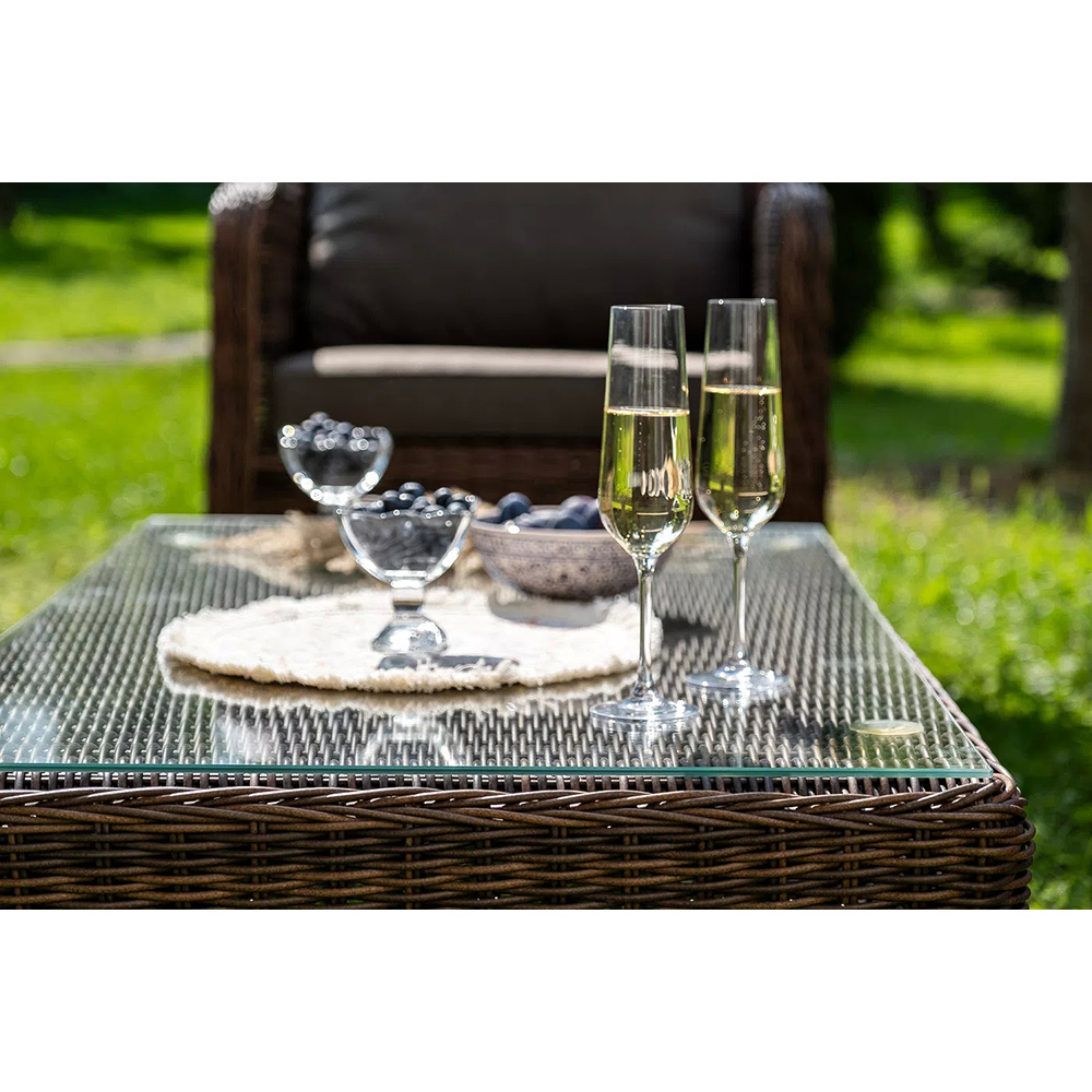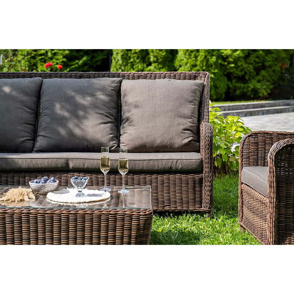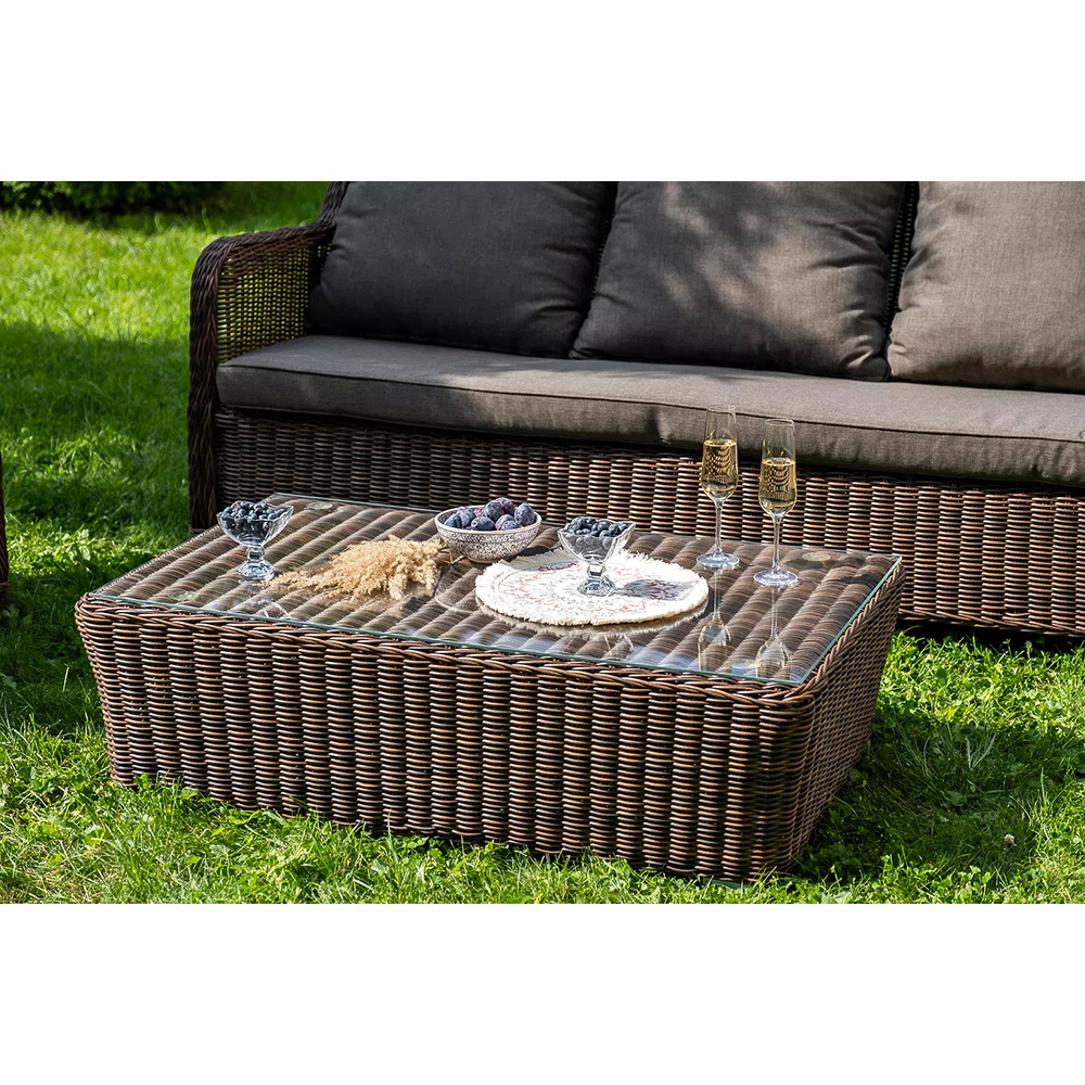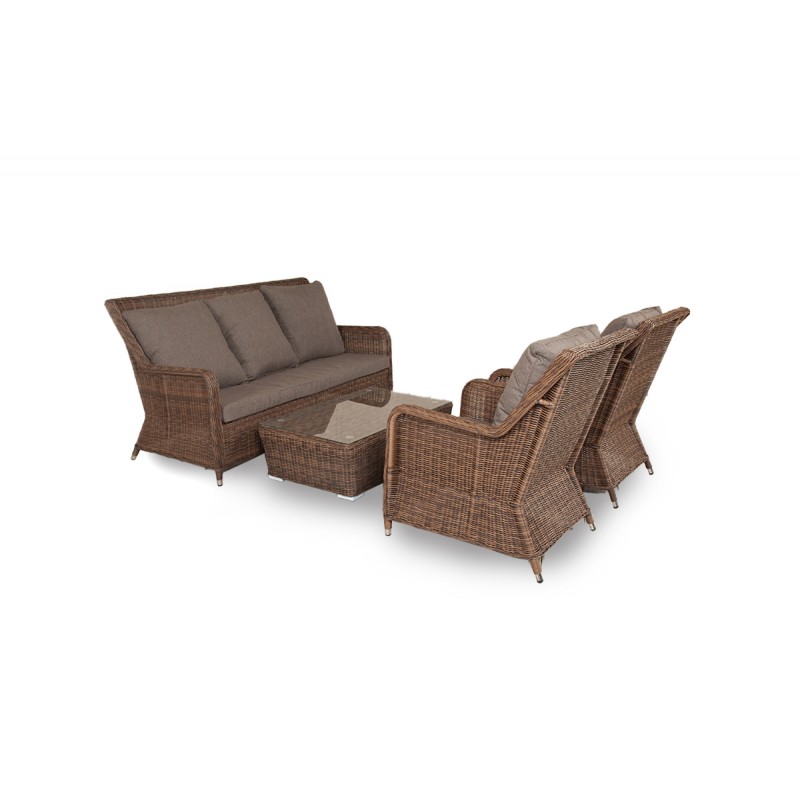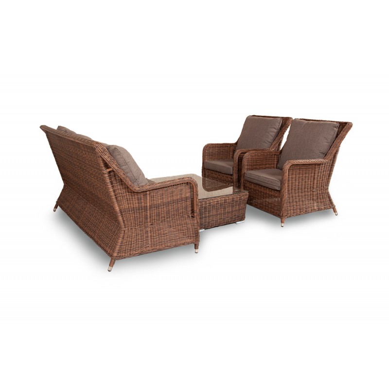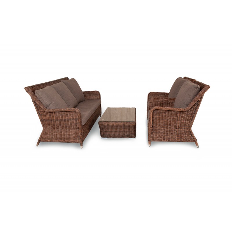 Лаунж зона из искусственного ротанга: 1 двухместный диван, 2 кресла и журнальный столик со стеклянной столешницей.