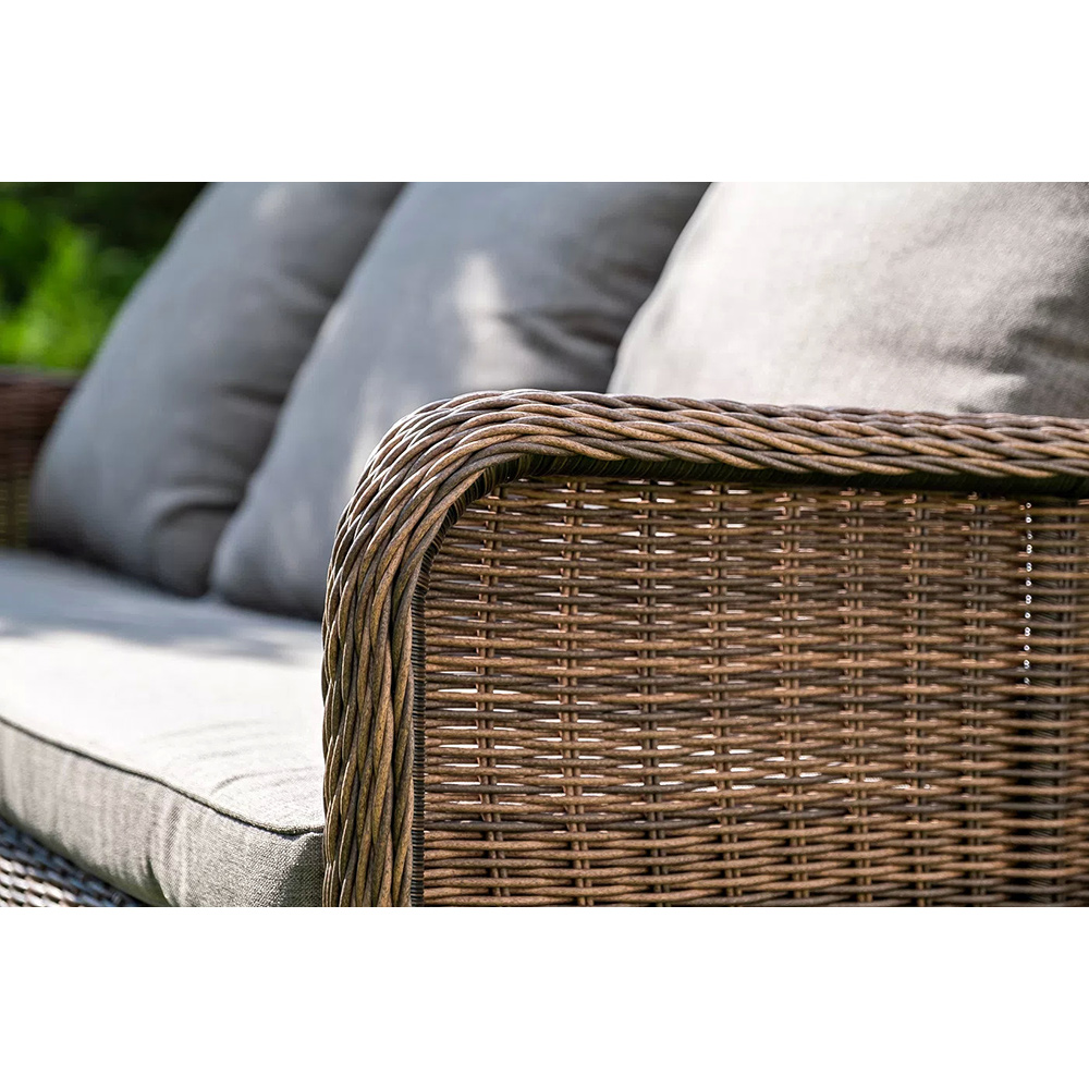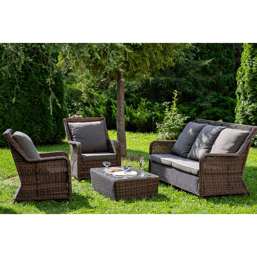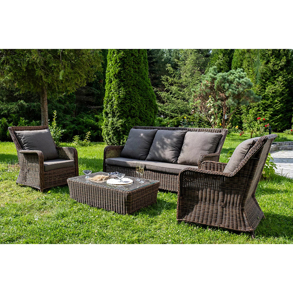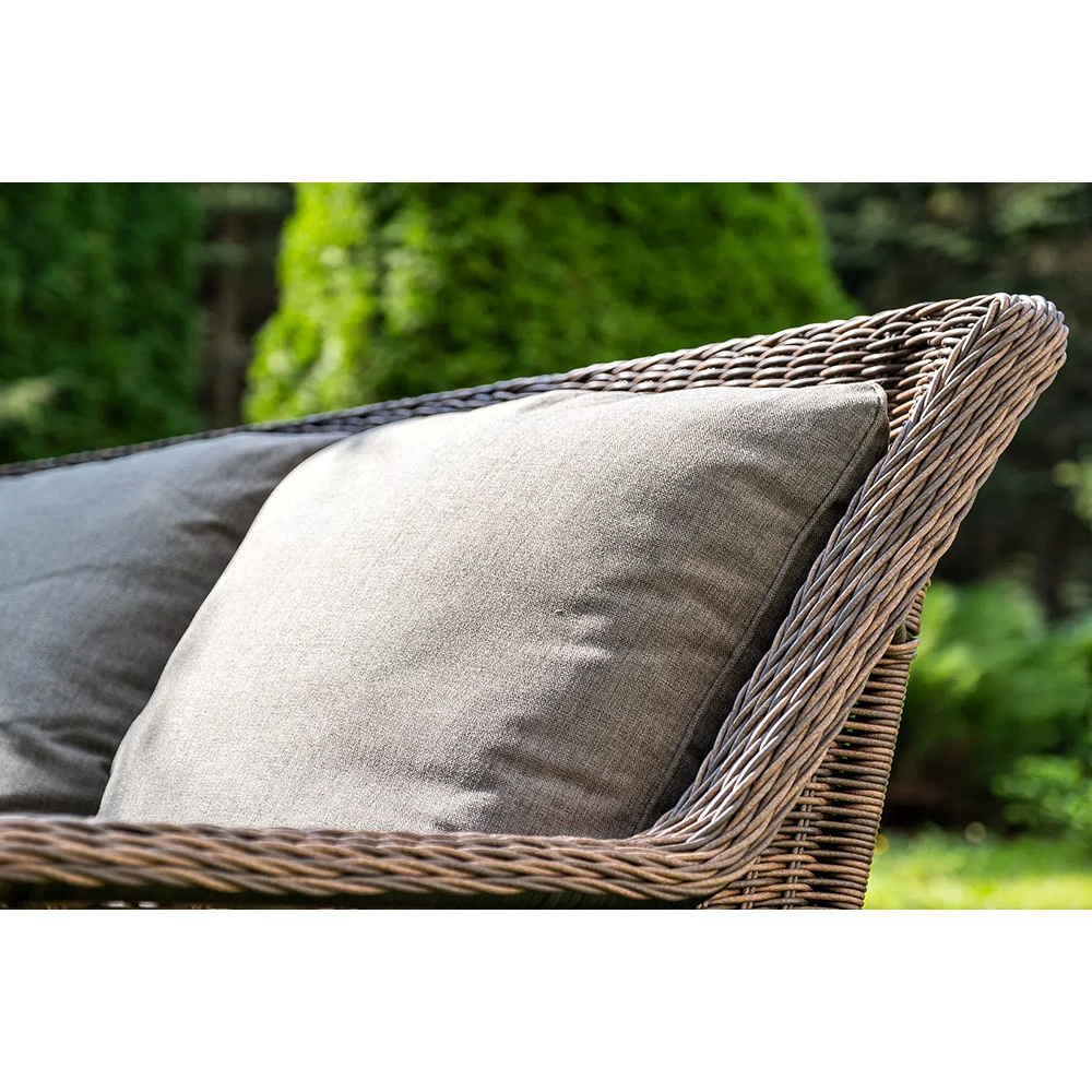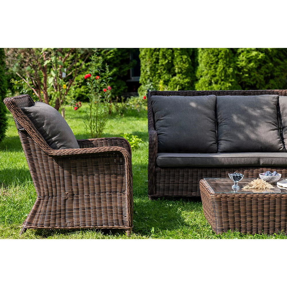 Лаунж зона из искусственного ротанга: 1 двухместный диван, 2 кресла и журнальный столик со стеклянной столешницей.