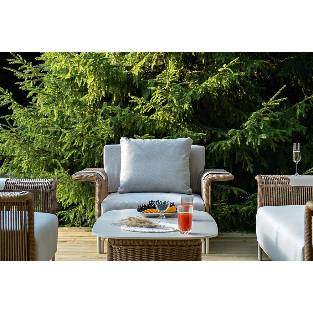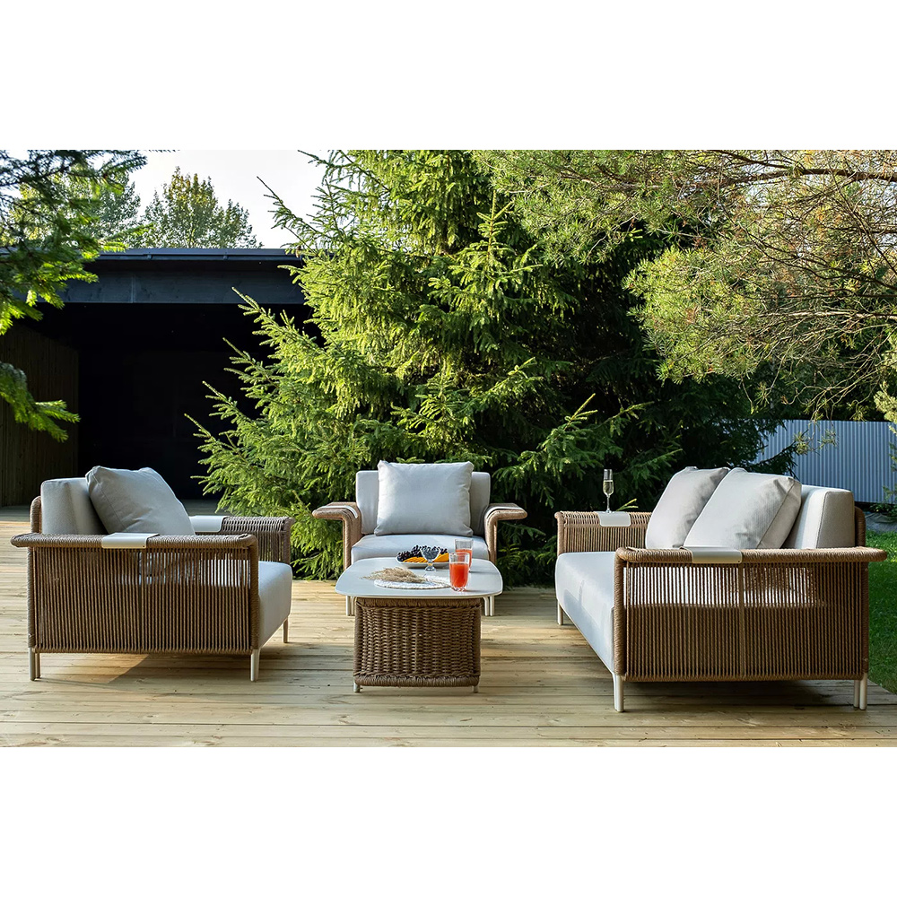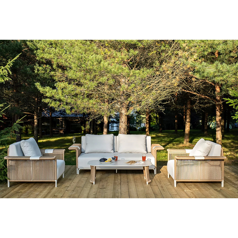 Комплект для лаунж-зоны «Мальдивы» рассчитан на 4 персоны. В состав входят: 2 кресла, двухместный диван и журнальный столик.
