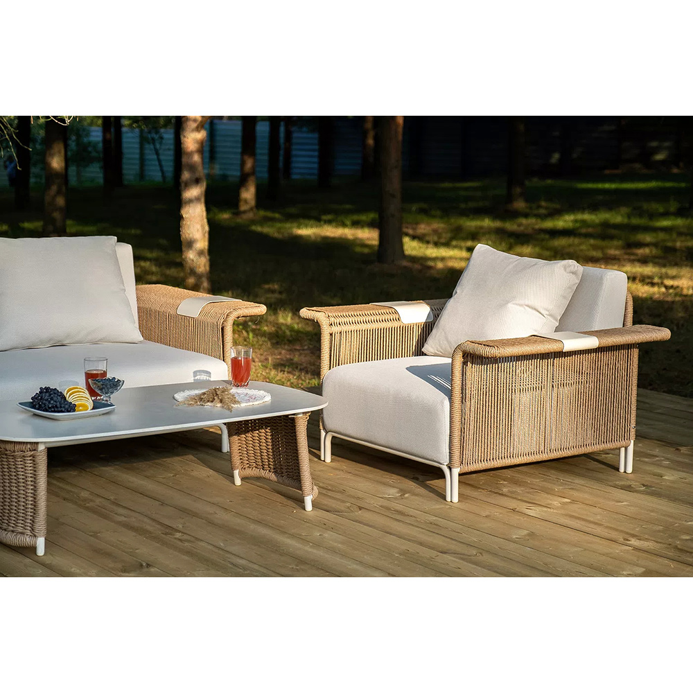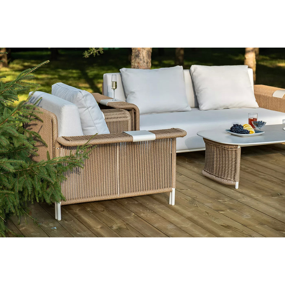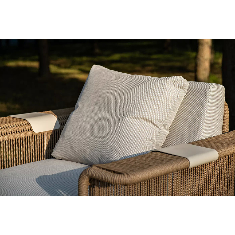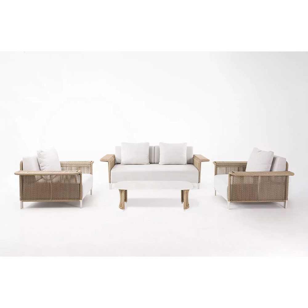 Комплект для лаунж-зоны «Мальдивы» рассчитан на 4 персоны. В состав входят: 2 кресла, двухместный диван и журнальный столик.