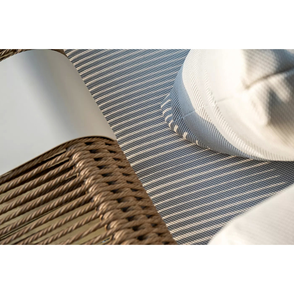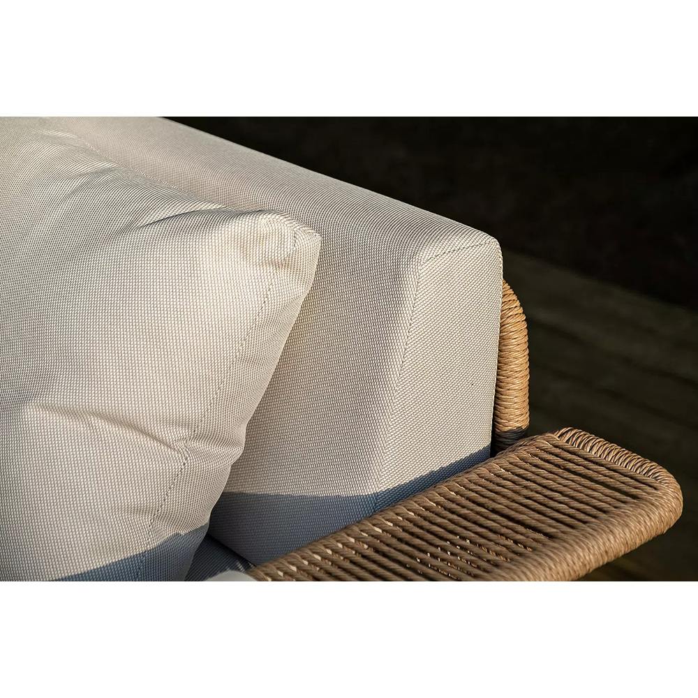 Укомплектовано плетеное кресло удобными мягкими подушками, одна из которых располагается в области спинки. Они выполнены в бежевом оттенке.