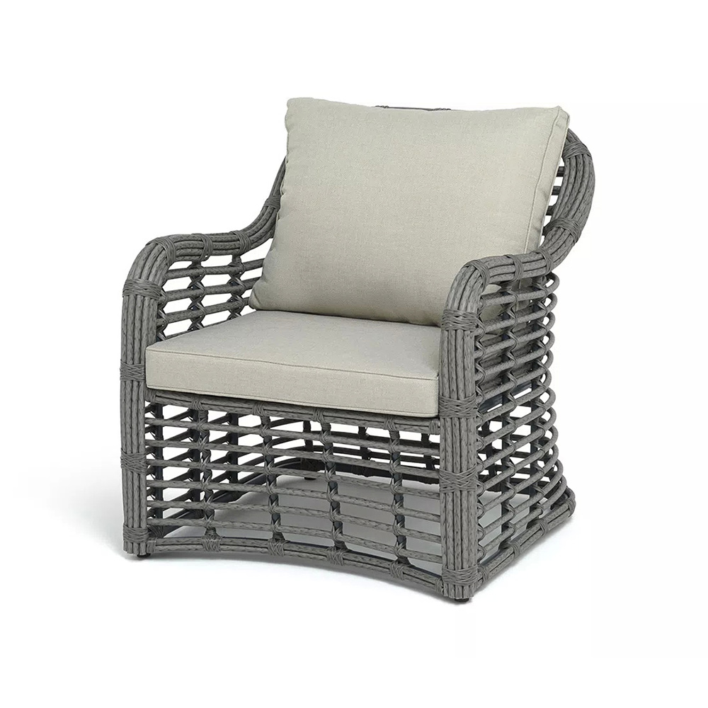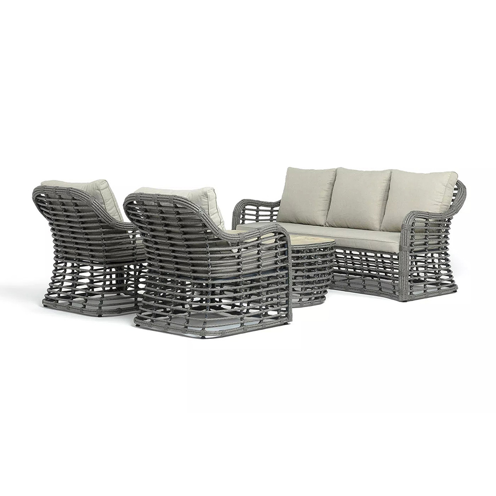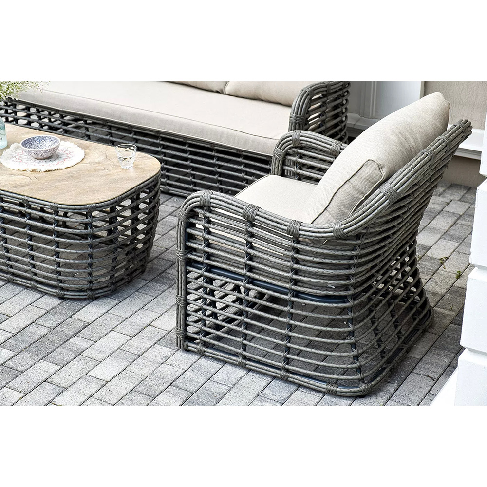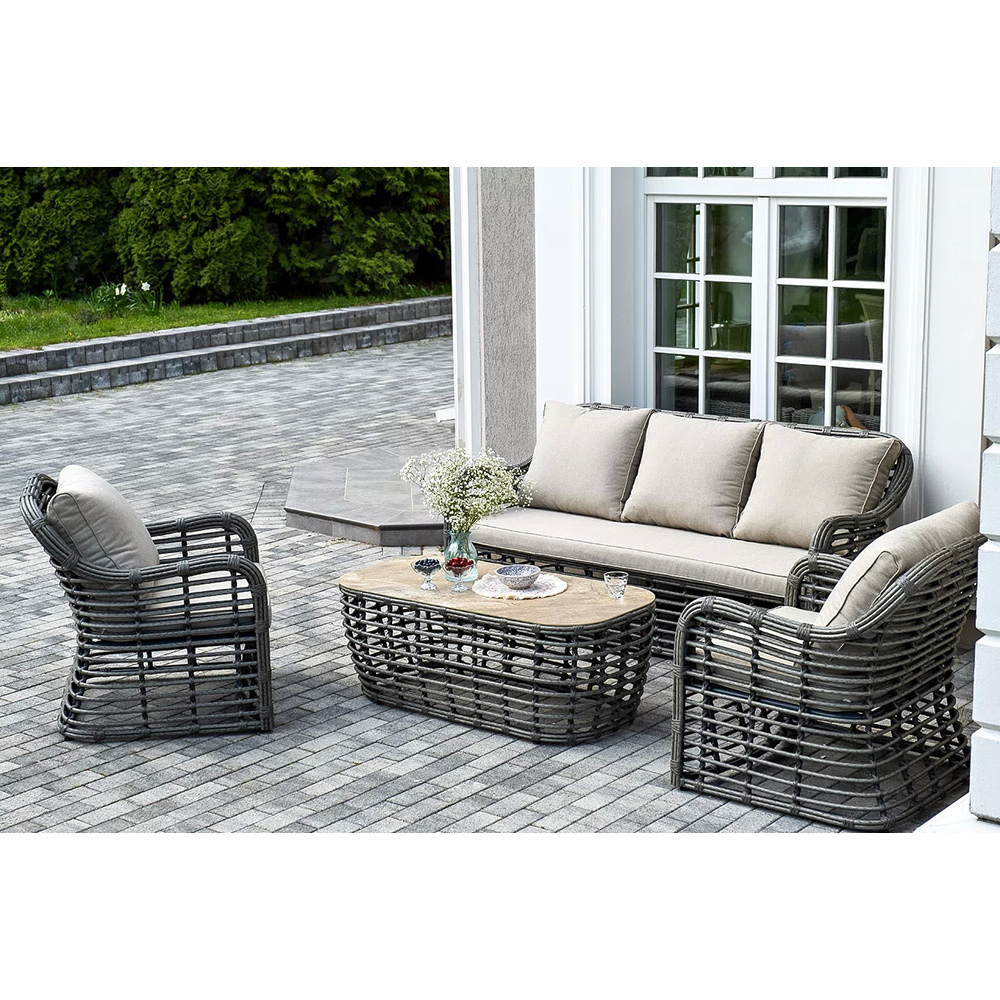 Вместительная лаунж-зона «Ницца» состоит из трехместного дивана, двух кресел и журнального столика. Модели имеют алюминиевый каркас, который оплетен вручную искусственным ротангом серого цвета.