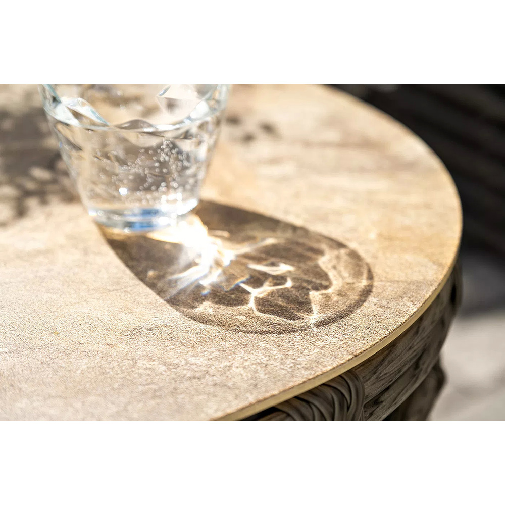 Журнальный столик выполнен из алюминия, вручную оплетенного круглым искусственным ротангом.