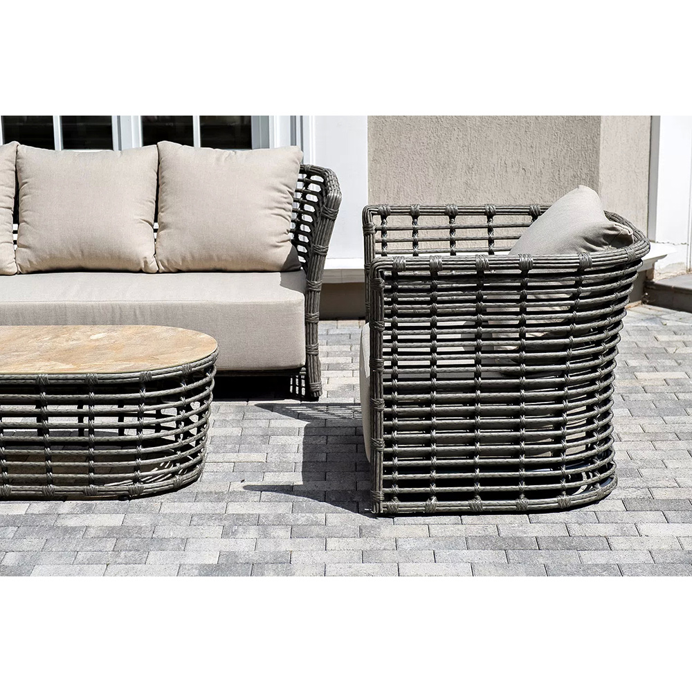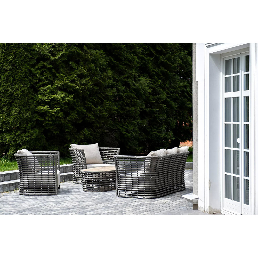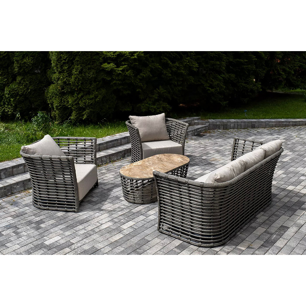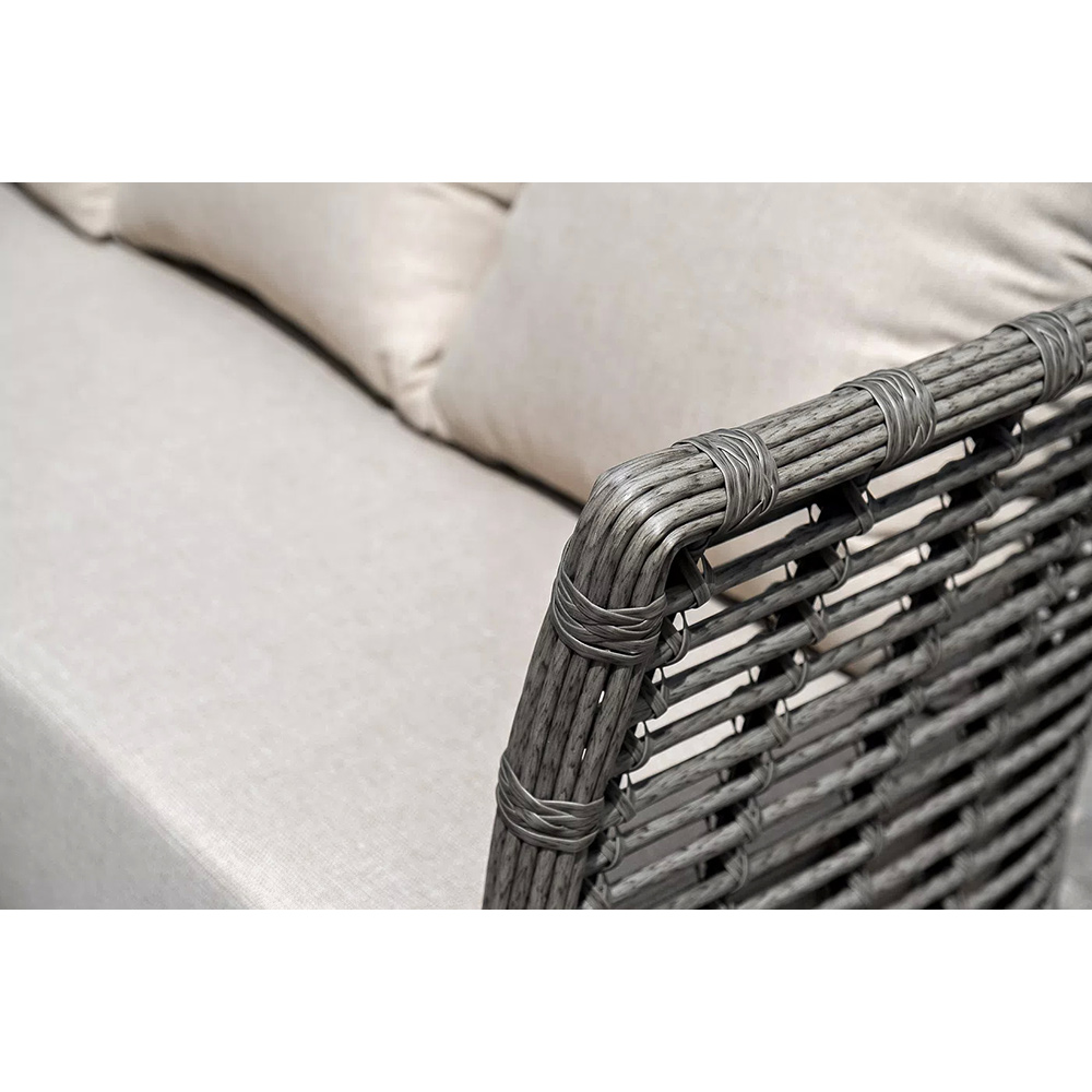 Модели имеют алюминиевый каркас, который оплетен вручную искусственным ротангом серого цвета.