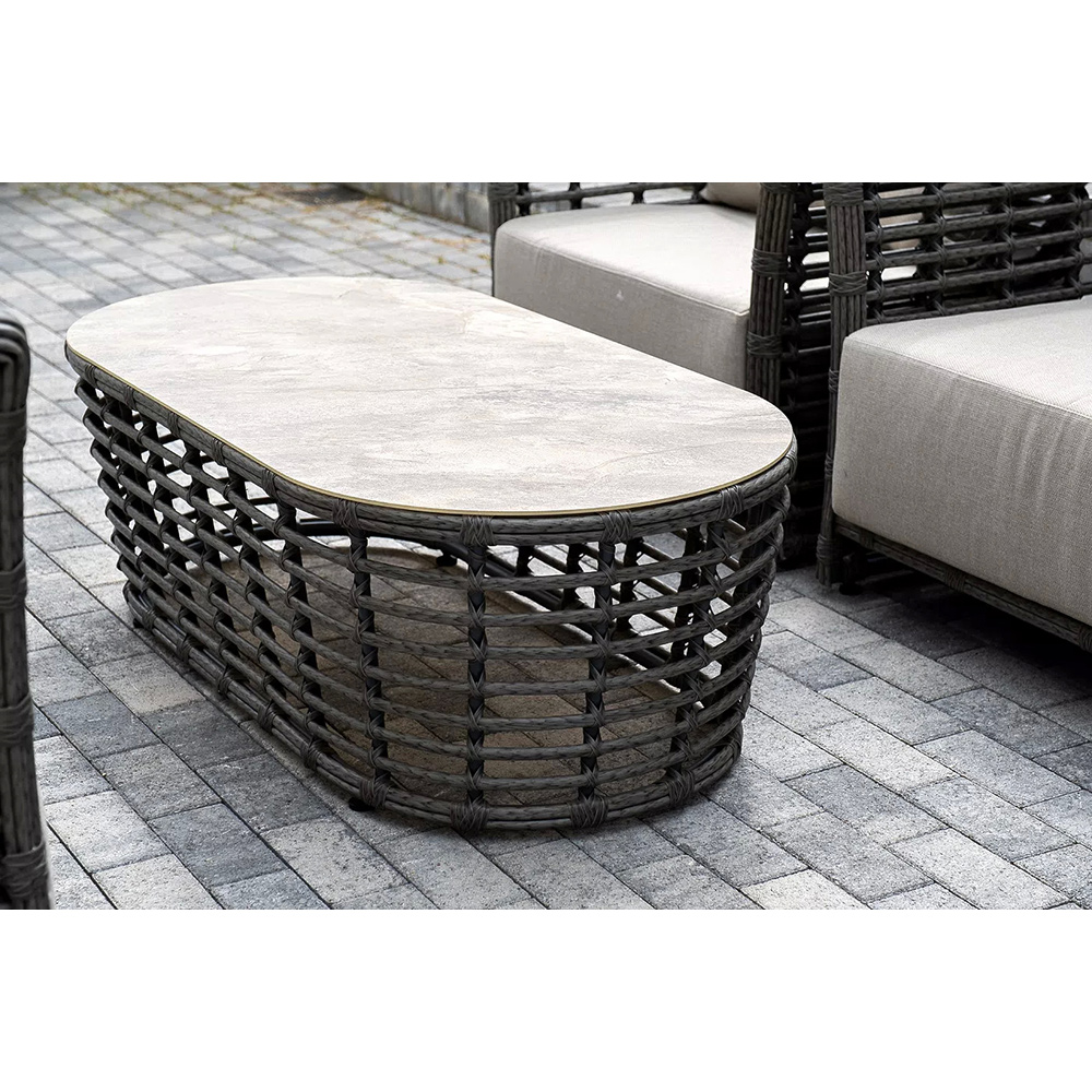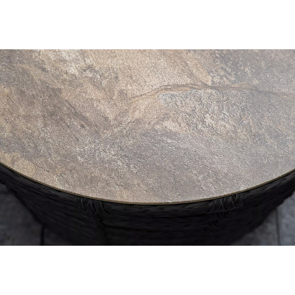 Журнальный столик выполнен из алюминия, вручную оплетенного круглым искусственным ротангом. Столешница из закаленного стекла толщиной 5 мм. Благодаря износостойким материалам, стол пригоден для использования на улице при любой погоде и не требует специальных условий хранения.