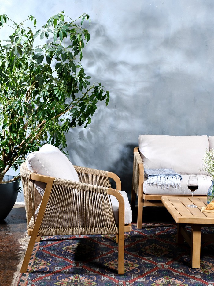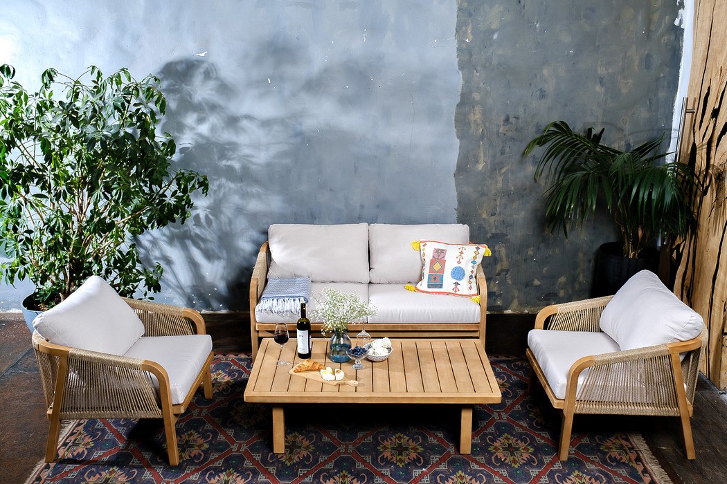 RIMINI – современная коллекция садовой мебели из акации, выполненная в комбинации натурального веревочного плетения rope, массива акации и бежевых подушек.