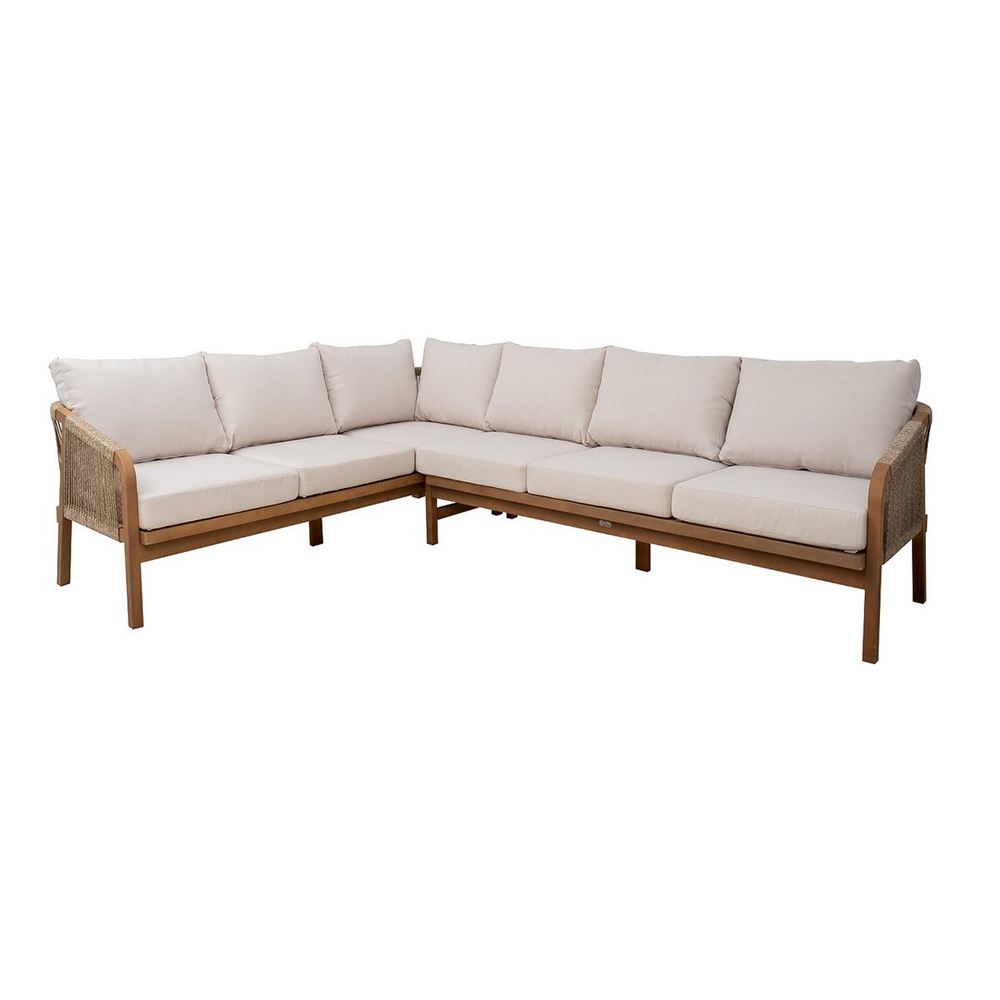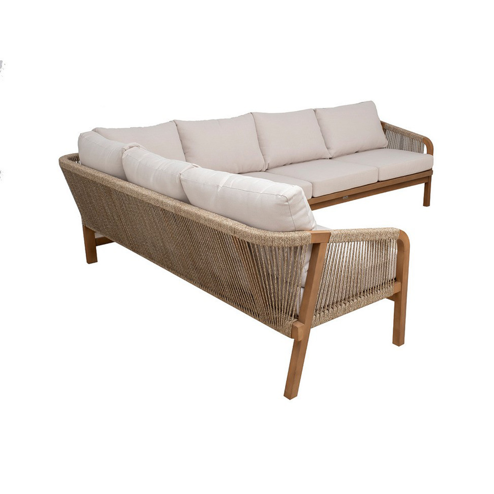 RIMINI – современная коллекция садовой мебели из акации, выполненная в комбинации натурального веревочного плетения rope, массива акации и бежевых подушек.