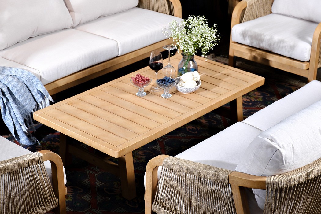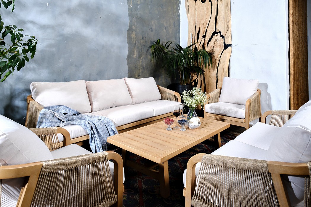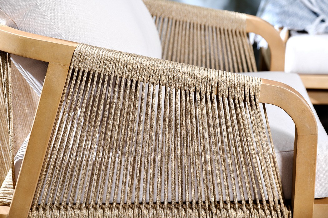RIMINI – современная коллекция садовой мебели из акации, выполненная в комбинации натурального веревочного плетения rope, массива акации и бежевых подушек.