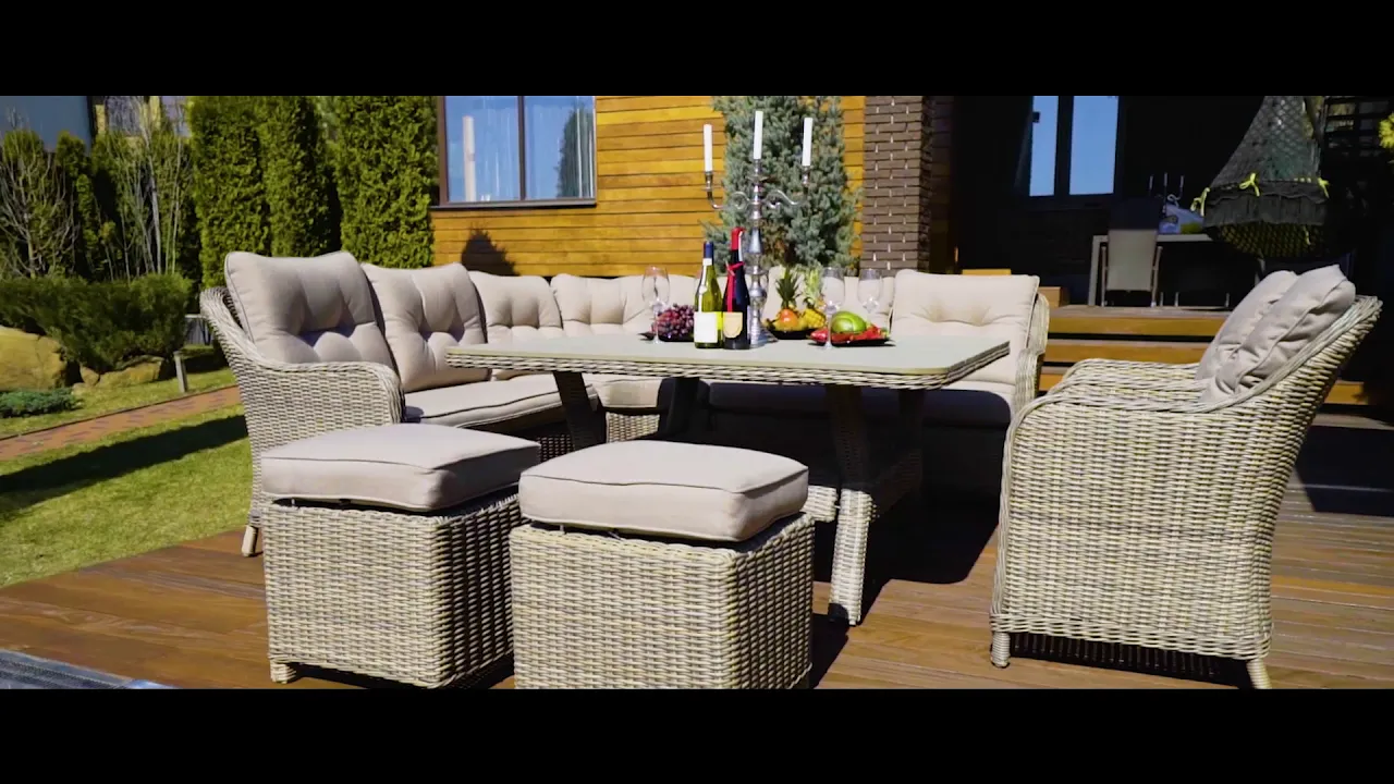 Комплектация: обеденный стол, большой угловой диван с подушками на семь человек, два кресла с подушками и два пуфика
