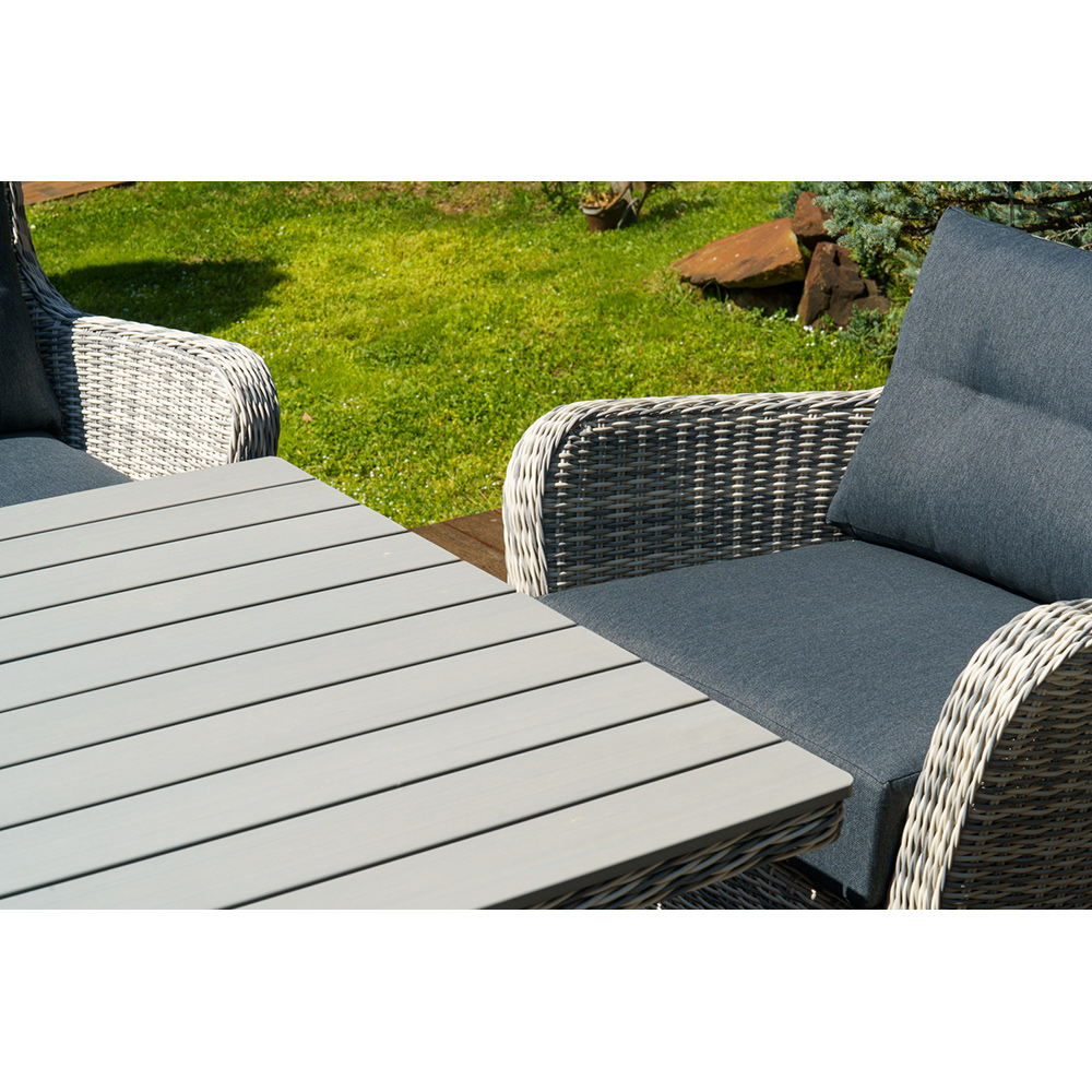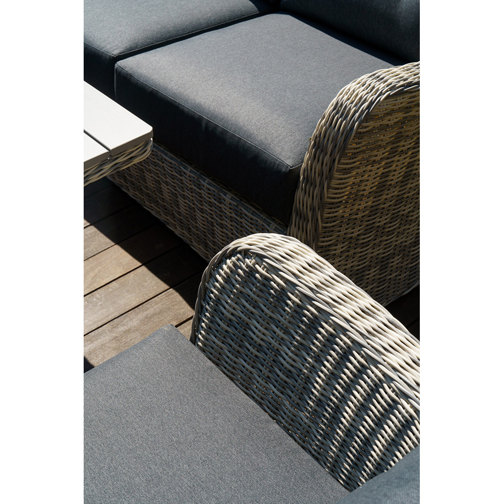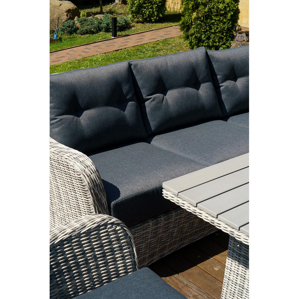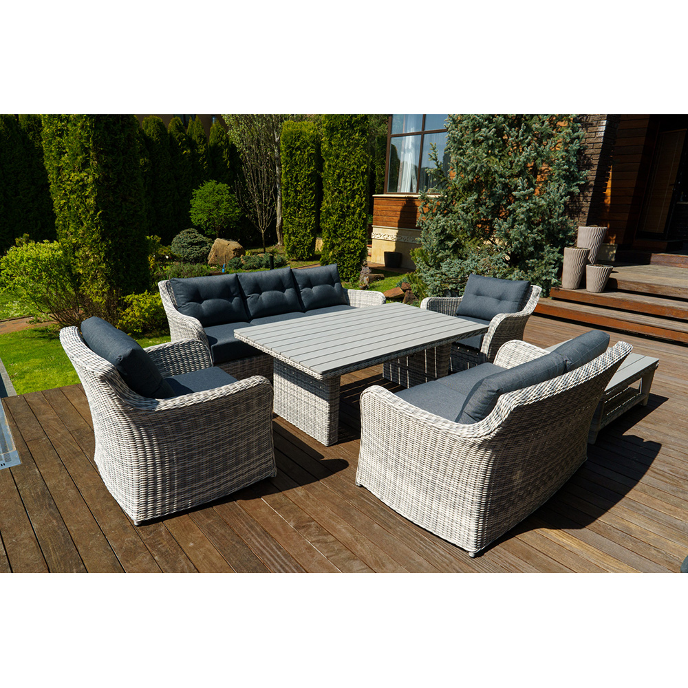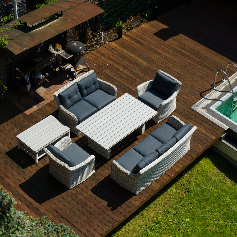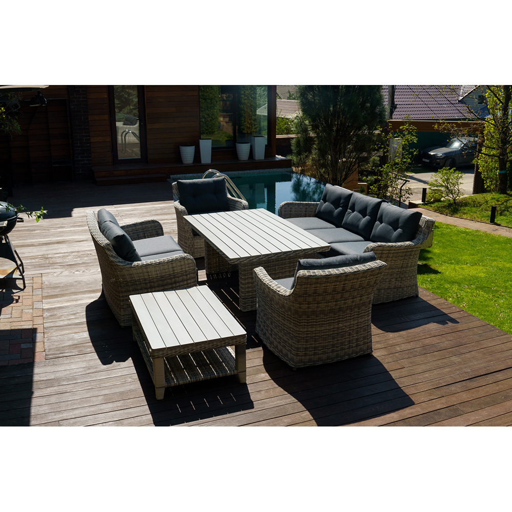 Набор ВЕНЕЦИЯ: лаунж стол 180 + 2-х и 3-х местный диван + 2 кресла + кофейный столик (цвет: серый) можно устанавливать в самых разнообразных местах: на летних верандах, садовых площадок и под открытым небом.Предоставляем Вам набор мебели из искусственного ротанга с возможностью менять количество изделий и создавать свой собственный стиль в интерьере.