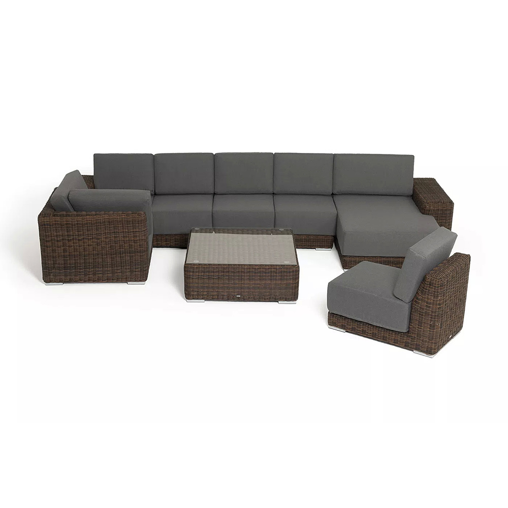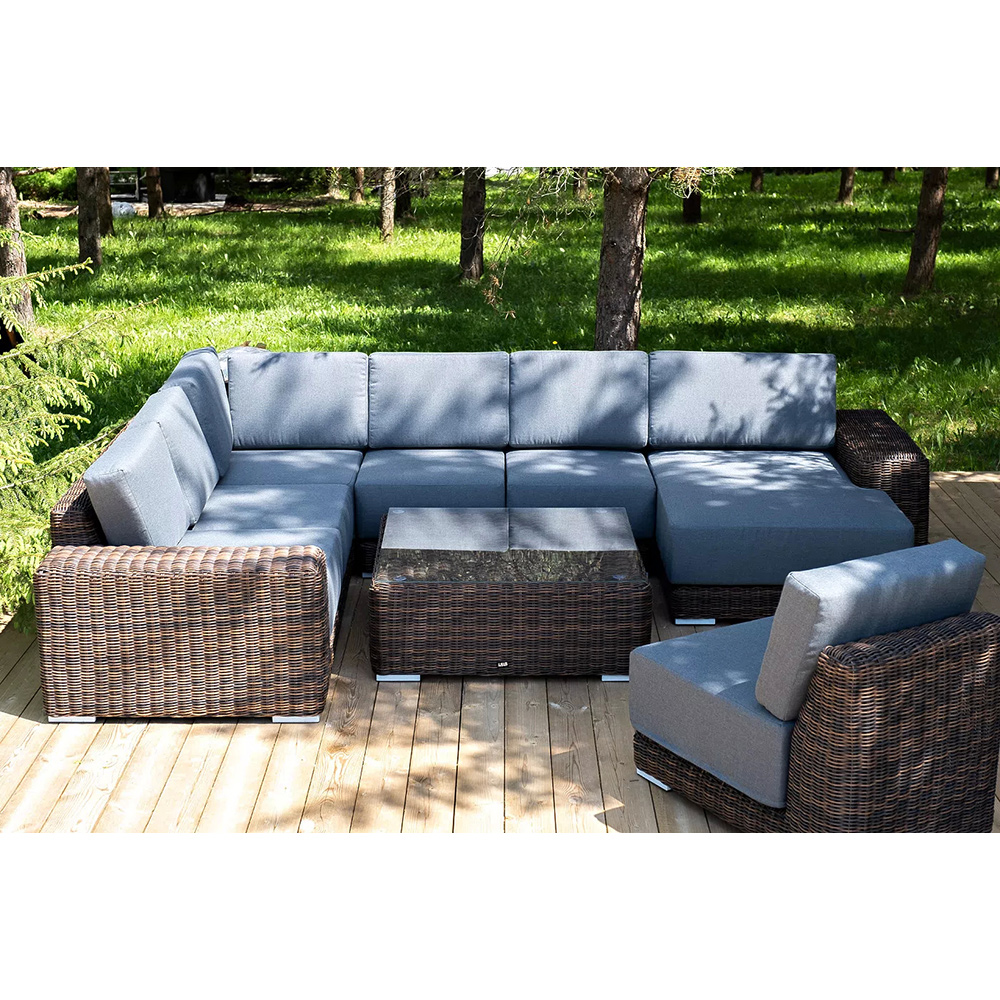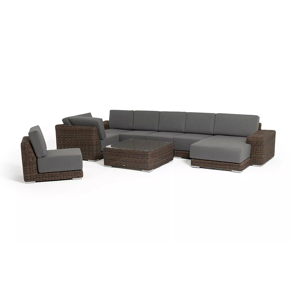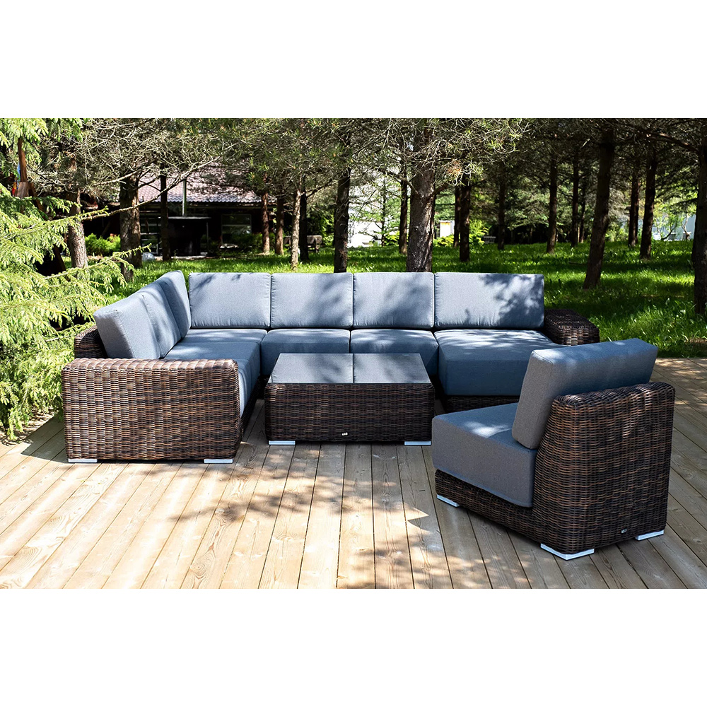 Она состоит из целого набора мебели, в который входит: плетеная кушетка, модуль правый, три прямых модуля, модуль угловой, журнальный столик.