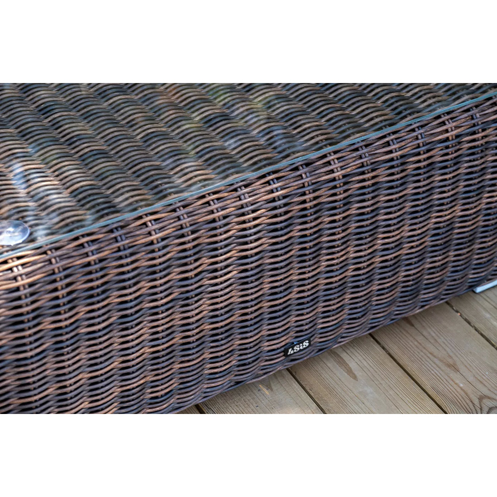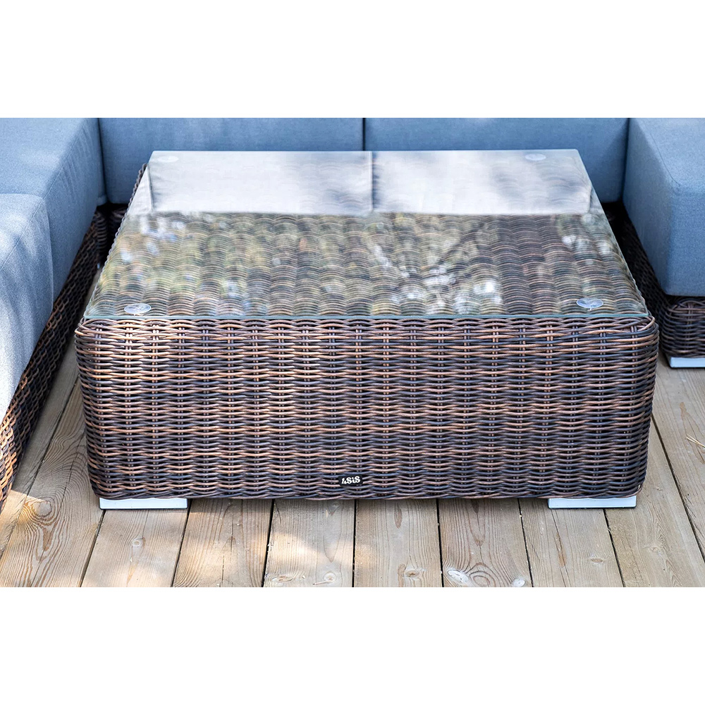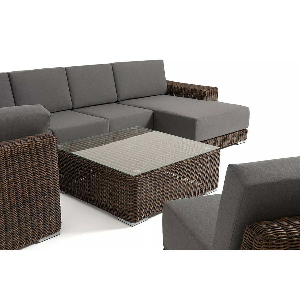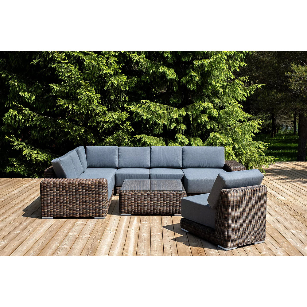 Она состоит из целого набора мебели, в который входит: плетеная кушетка, модуль правый, три прямых модуля, модуль угловой, журнальный столик.