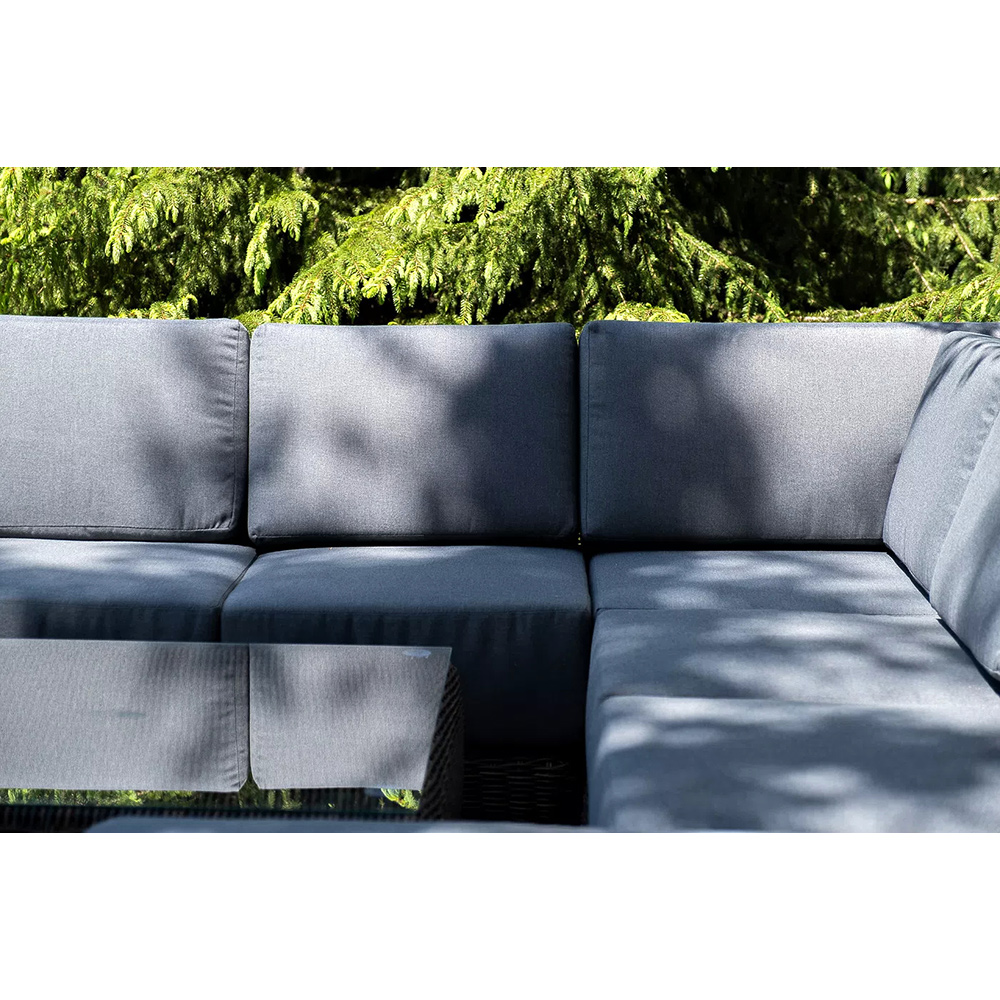 Модули дивана и кушетка укомплектованы подушками со съёмными чехлами серого цвета. Защитные качества материала усилены путем его обработки влагоотталкивающими составами.